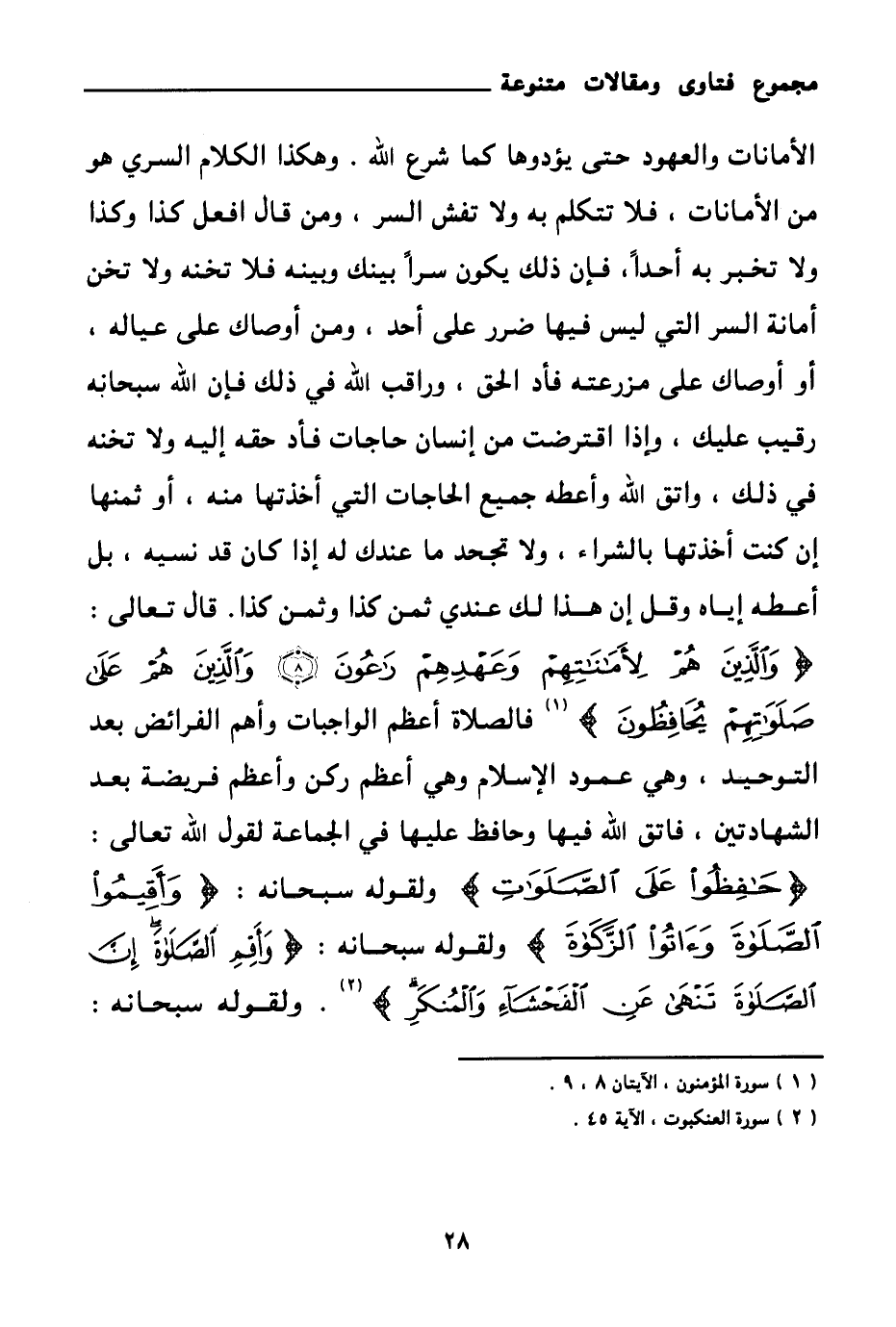 قال تعالى: {وَالَّذِينَ هُمْ لِأَمَانَاتِهِمْ وَعَهْدِهِمْ رَاعُونَ} (¬1) {وَالَّذِينَ هُمْ عَلَى صَلَوَاتِهِمْ يُحَافِظُونَ} (¬2) فالصلاة أعظم الواجبات وأهم الفرائض بعد التوحيد، وهي عمود الإسلام وهي أعظم ركن وأعظم فريضة بعد الشهادتين، فاتق الله فيها وحافظ عليها في الجماعة لقول الله تعالى: {حَافِظُوا عَلَى الصَّلَوَاتِ} (¬3) ولقوله سبحانه: {وَأَقِيمُوا الصَّلَاةَ وَآتُوا الزَّكَاةَ} (¬4) ولقوله سبحانه: {وَأَقِمِ الصَّلَاةَ إِنَّ الصَّلَاةَ تَنْهَى عَنِ الْفَحْشَاءِ وَالْمُنْكَرِ} (¬5) ولقوله سبحانه: