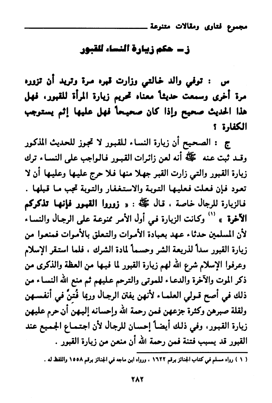 ج: الصحيح أن زيارة النساء للقبور لا تجوز للحديث المذكور، وقد ثبت عنه صلى الله عليه وسلم أنه «لعن زائرات القبور (¬1) » ، فالواجب على النساء ترك زيارة القبور والتي زارت القبر جهلا منها فلا حرج عليها وعليها أن لا تعود فإن فعلت فعليها التوبة والاستغفار، والتوبة تجب ما قبلها. فالزيارة للرجال خاصة، قال صلى الله عليه وسلم: «زوروا القبور فإنها تذكركم الآخرة (¬2) » .