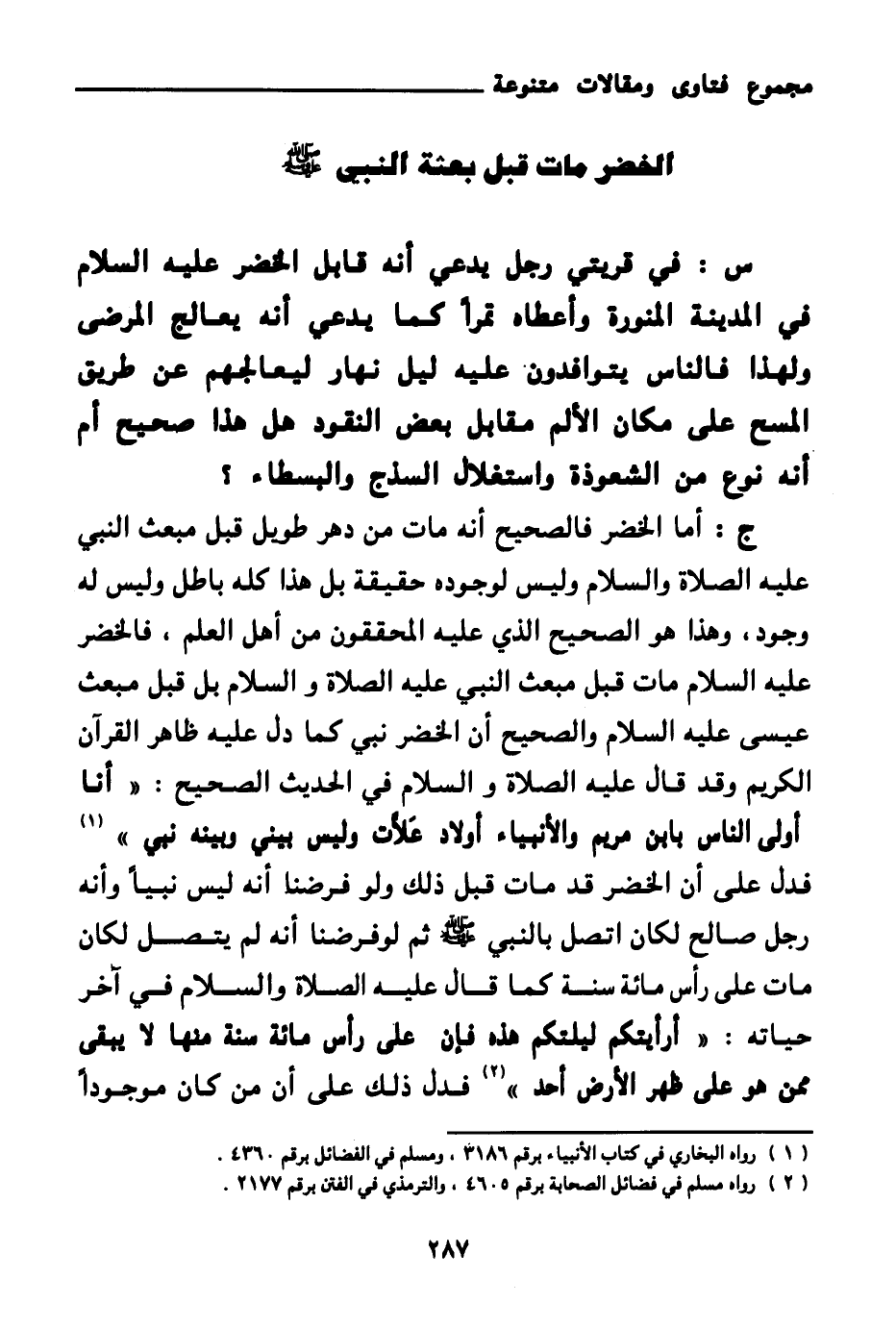 ج: أما الخضر فالصحيح أنه مات من دهر طويل قبل مبعث النبي عليه الصلاة والسلام وليس لوجوده حقيقة بل هذا كله باطل وليس له وجود، وهذا هو الصحيح الذي عليه المحققون من أهل العلم، فالخضر عليه السلام مات قبل مبعث النبي عليه الصلاة والسلام بل قبل مبعث عيسى عليه السلام والصحيح أن الخضر نبي كما دل عليه ظاهر القرآن الكريم وقد قال عليه الصلاة والسلام في الحديث الصحيح: «أنا أولى الناس بابن مريم والأنبياء أولاد علات وليس بيني وبينه نبي (¬1) » فدل على أن الخضر قد مات قبل ذلك ولو فرضنا أنه ليس نبيا وأنه رجل صالح لكان اتصل بالنبي صلى الله عليه وسلم.