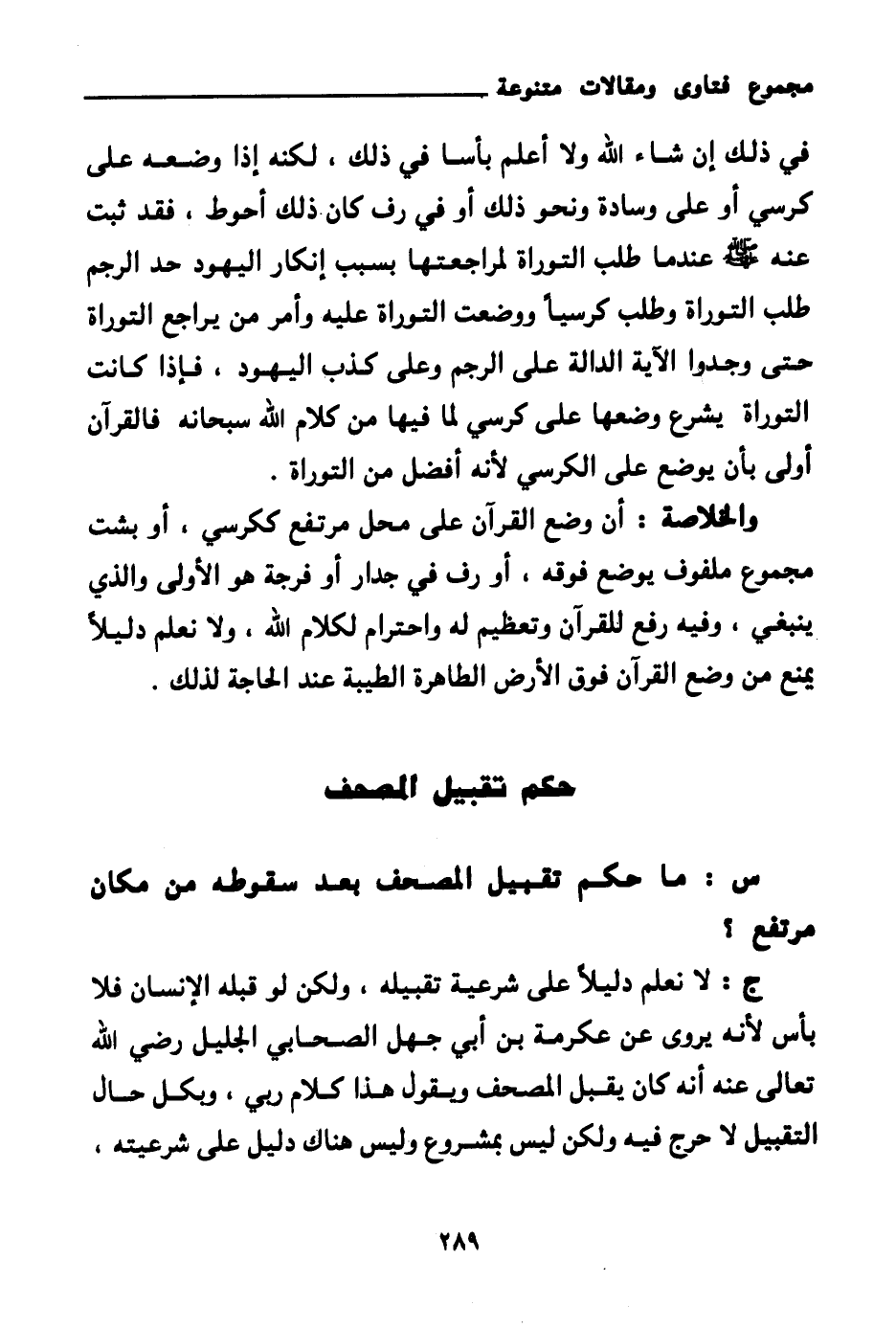 س: ما حكم تقبيل المصحف عند سقوطه من مكان مرتفع؟