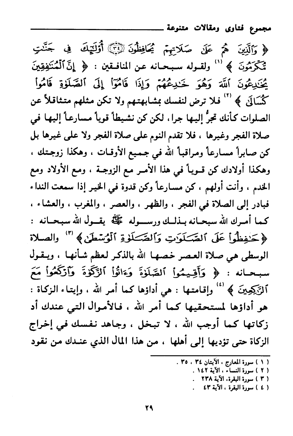 {وَالَّذِينَ هُمْ عَلَى صَلَاتِهِمْ يُحَافِظُونَ} (¬1) {أُولَئِكَ فِي جَنَّاتٍ مُكْرَمُونَ} (¬2) ولقوله سبحانه عن المنافقين: {إِنَّ الْمُنَافِقِينَ يُخَادِعُونَ اللَّهَ وَهُوَ خَادِعُهُمْ وَإِذَا قَامُوا إِلَى الصَّلَاةِ قَامُوا كُسَالَى} (¬3)
