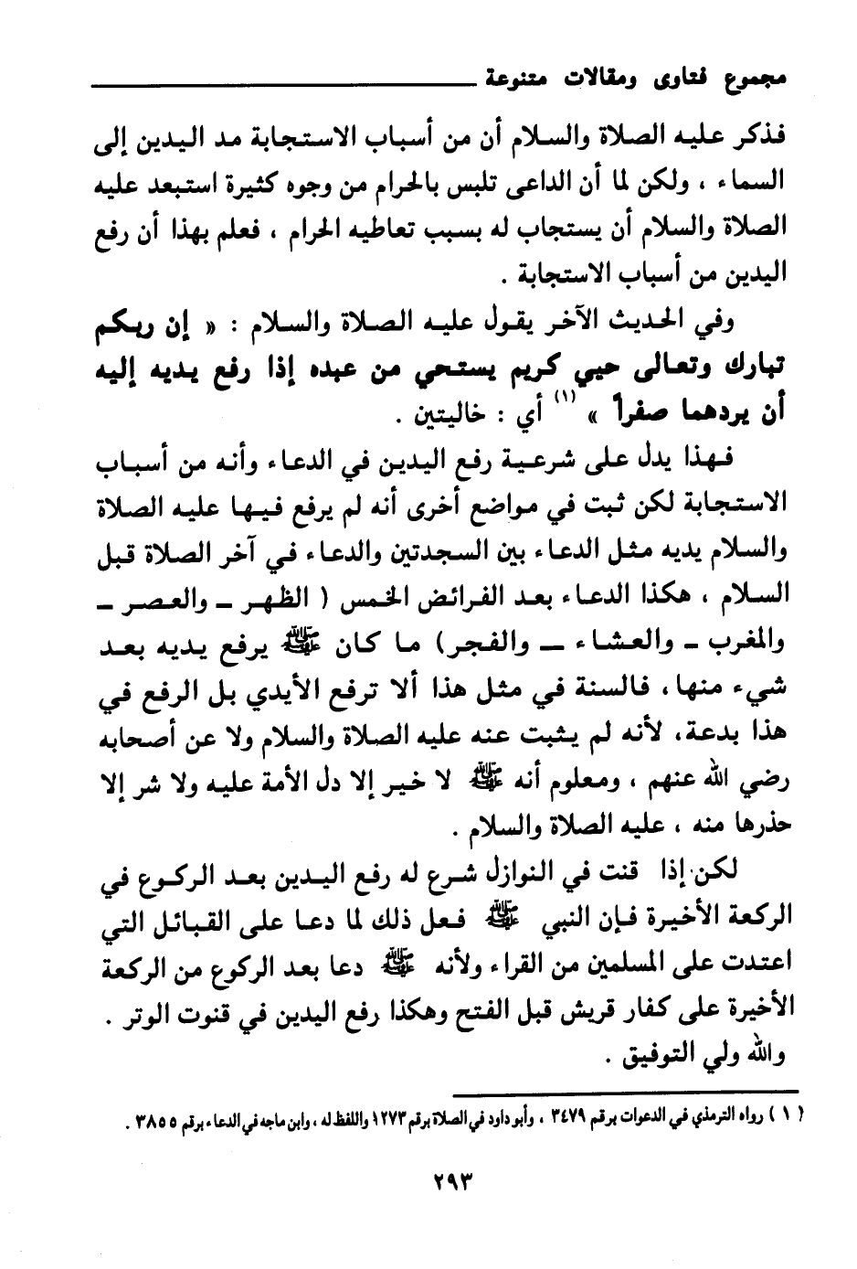 وفي الحديث الآخر يقول عليه الصلاة والسلام: «إن ربكم تبارك وتعالى حيي كريم يستحي من عبده إذا رفع يديه إليه أن يردهما صفرا (¬1) » أي: خاليتين. فهذا يدل على شرعية رفع اليدين في الدعاء وأنه من أسباب الاستجابة لكن ثبت في مواضع أخرى أنه لم يرفع فيها عليه الصلاة والسلام يديه مثل الدعاء بين السجدتين والدعاء في آخر الصلاة قبل السلام، هكذا الدعاء بعد الفرائض الخمس (الظهر - والعصر - والمغرب - والعشاء - والفجر) ما كان صلى الله عليه وسلم يرفع يديه بعد شيء منها، فالسنة في مثل هذا ألا ترفع الأيدي، بل الرفع في هذا بدعة؛ لأنه لم يثبت عنه عليه الصلاة والسلام ولا عن أصحابه رضي الله عنهم، ومعلوم أنه صلى الله عليه وسلم لا خير إلا دل الأمة عليه، ولا شر إلا حذرها منه، عليه الصلاة والسلام.