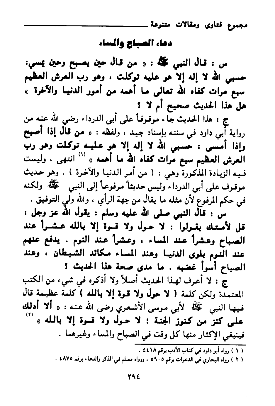 ج: هذا الحديث جاء موقوفا على أبي الدرداء رضي الله عنه من رواية أبي داود في سننه بإسناد جيد، ولفظه: «من قال إذا أصبح وإذا أمسى: حسبي الله لا إله إلا هو عليه توكلت وهو رب العرش العظيم سبع مرات كفاه الله ما أهمه (¬2) » انتهى، وليست فيه الزيادة المذكورة وهي: (من أمر الدنيا والآخرة) . وهو حديث موقوف على أبي الدرداء وليس حديثا مرفوعا إلى النبي صلى الله عليه وسلم ولكنه في حكم المرفوع؛ لأن مثله ما يقال من جهة الرأي، والله ولي التوفيق.