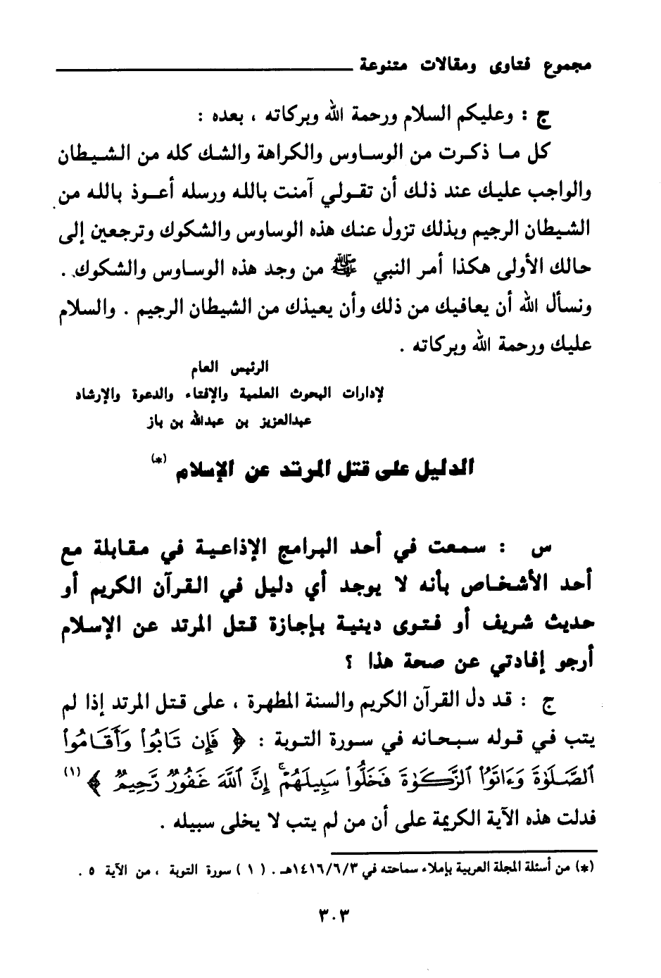 ج: قد دل القرآن الكريم والسنة المطهرة على قتل المرتد إذا لم يتب في قوله سبحانه في سورة التوبة: {فَإِنْ تَابُوا وَأَقَامُوا الصَّلَاةَ وَآتَوُا الزَّكَاةَ فَخَلُّوا سَبِيلَهُمْ إِنَّ اللَّهَ غَفُورٌ رَحِيمٌ} (¬2) فدلت هذه الآية الكريمة على أن من لم يتب لا يخلى سبيله.