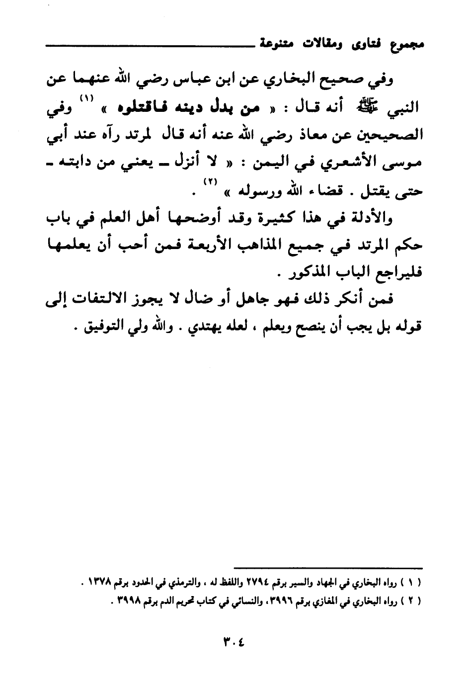 وفي صحيح البخاري عن ابن عباس رضي الله عنهما عن النبي صلى الله عليه وسلم أنه قال: «من بدل دينه فاقتلوه (¬1) » وفي الصحيحين عن معاذ رضي الله عنه أنه قال لمرتد رآه عند أبي موسى الأشعري في اليمن: لا أنزل -يعني من دابته- حتى يقتل. قضاء الله ورسوله. (¬2) والأدلة في هذا كثيرة وقد أوضحها أهل العلم في باب حكم المرتد في جميع المذاهب الأربعة فمن أحب أن يعلمها فليراجع الباب المذكور.