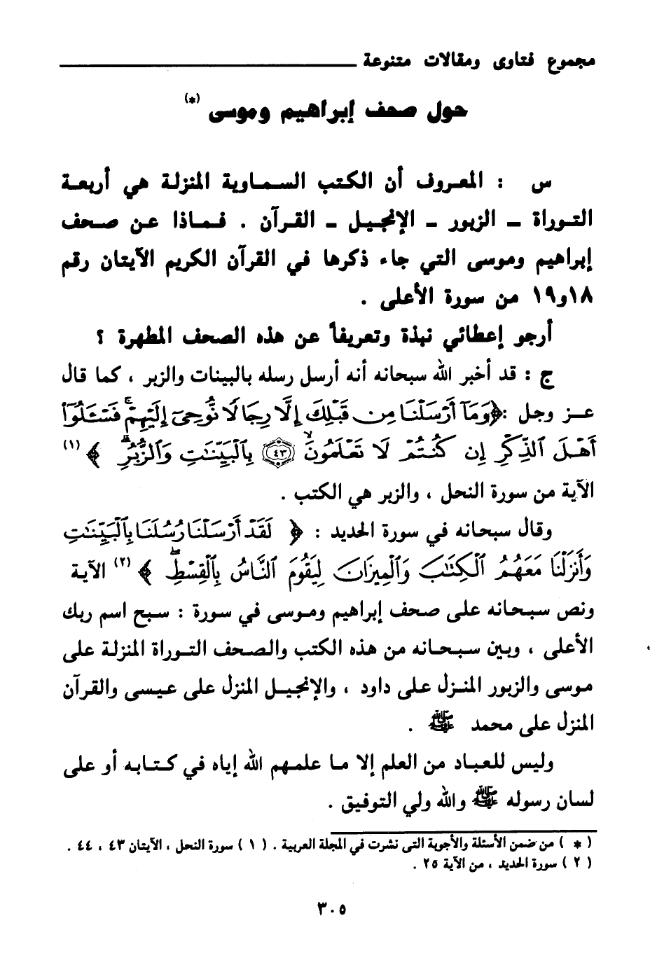 س: المعروف أن الكتب السماوية المنزلة هي أربعة: التوراة- الزبور- الإنجيل- القرآن. فماذا عن صحف إبراهيم وموسى التي جاء ذكرها في القرآن الكريم الآيتان رقم 18 و 19 من سورة الأعلى.