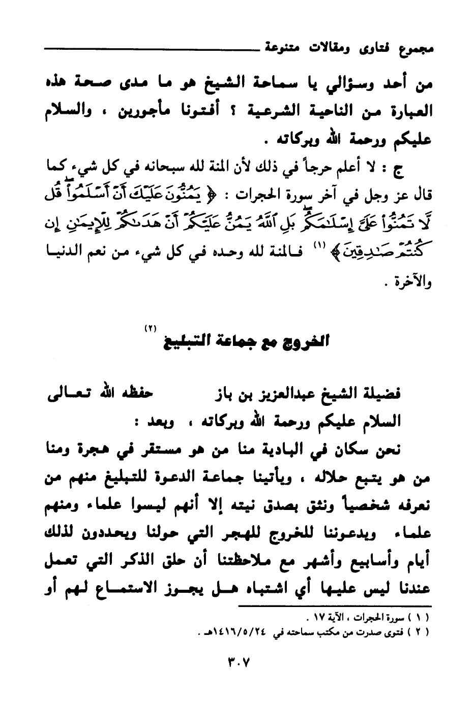 فضيلة الشيخ عبد العزيز بن باز حفظه الله تعالى السلام عليكم ورحمة الله وبركاته. وبعد: نحن سكان في البادية منا من هو مستقر في هجرة ومنا من هو يتبع حلاله، ويأتينا جماعة الدعوة للتبليغ منهم من نعرفه شخصيا ونثق بصدق نيته إلا أنهم ليسوا علماء ومنهم علماء ويدعوننا للخروج للهجر التي حولنا ويحددون لذلك أيام وأسابيع وأشهر مع ملاحظتنا أن حلق الذكر التي تعمل عندنا ليس عليها أي اشتباه هل يجوز الاستماع لهم أو