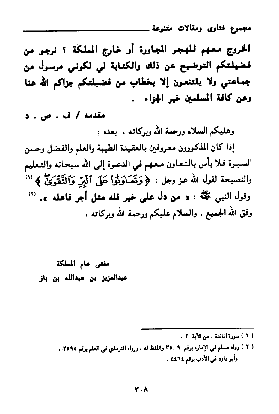 وعليكم السلام ورحمة الله وبركاته، بعده: إذا كان المذكورون معروفين بالعقيدة الطيبة والعلم والفضل وحسن السيرة فلا بأس بالتعاون معهم في الدعوة إلى الله سبحانه والتعليم والنصيحة لقول الله عز وجل: {وَتَعَاوَنُوا عَلَى الْبِرِّ وَالتَّقْوَى} (¬1) وقول النبي صلى الله عليه وسلم: «من دل على خير فله مثل أجر فاعله (¬2) » . وفق الله الجميع. والسلام عليكم ورحمة الله وبركاته.
