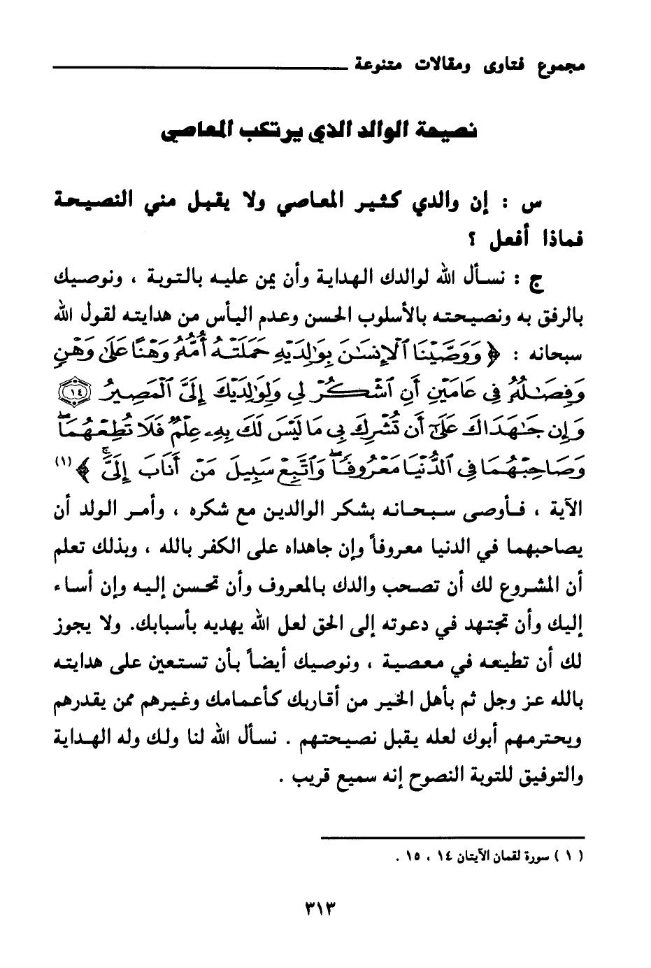 ج: نسأل الله لوالدك الهداية وأن يمن عليه بالتوبة، ونوصيك بالرفق به ونصيحته بالأسلوب الحسن وعدم اليأس من هدايته لقول الله سبحانه: {وَوَصَّيْنَا الْإِنْسَانَ بِوَالِدَيْهِ حَمَلَتْهُ أُمُّهُ وَهْنًا عَلَى وَهْنٍ وَفِصَالُهُ فِي عَامَيْنِ أَنِ اشْكُرْ لِي وَلِوَالِدَيْكَ إِلَيَّ الْمَصِيرُ} (¬1) {وَإِنْ جَاهَدَاكَ عَلى أَنْ تُشْرِكَ بِي مَا لَيْسَ لَكَ بِهِ عِلْمٌ فَلَا تُطِعْهُمَا وَصَاحِبْهُمَا فِي الدُّنْيَا مَعْرُوفًا وَاتَّبِعْ سَبِيلَ مَنْ أَنَابَ إِلَيَّ} (¬2) الآية.