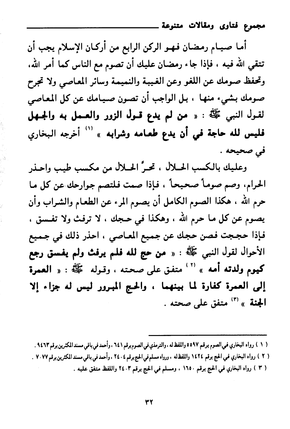 وعليك بالكسب الحلال، تحر الحلال من مكسب طيب واحذر الحرام، وصم صوما صحيحا، فإذا صمت فلتصم جوارحك عن كل ما حرم الله، هكذا الصوم الكامل أن يصوم المرء عن الطعام والشراب وأن يصوم عن كل ما حرم الله، وهكذا في حجك، لا ترفث ولا تفسق، فإذا حججت فصن حجك عن جميع المعاصي، احذر ذلك في جميع الأحوال لقول النبي صلى الله عليه وسلم: «من حج لله فلم يرفث ولم يفسق رجع كيوم ولدته أمه (¬2) » متفق على صحته. وقوله صلى الله عليه وسلم: «العمرة إلى العمرة كفارة لما بينهما والحج المبرور ليس له جزاء إلا الجنة (¬3) » متفق على صحته.