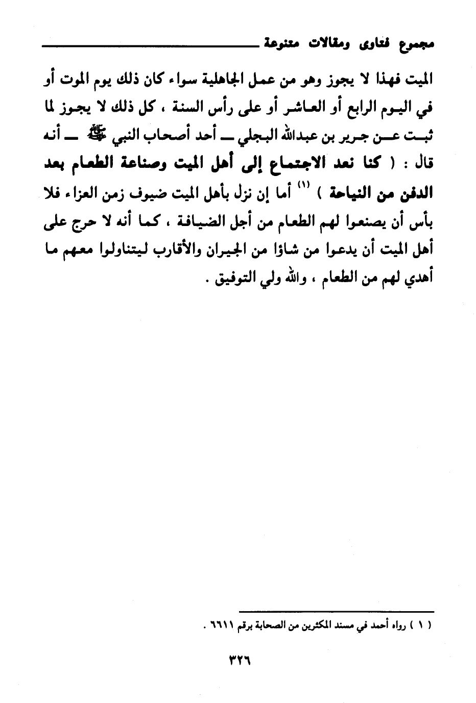 الميت فهذا لا يجوز وهو من عمل الجاهلية سواء كان ذلك يوم الموت أو في اليوم الرابع أو العاشر أو على رأس السنة، كل ذلك لا يجوز لما ثبت عن جرير بن عبد الله البجلي - أحد أصحاب النبي صلى الله عليه وسلم- أنه قال: «كنا نعد الاجتماع إلى أهل الميت وصناعة الطعام بعد الدفن من النياحة (¬1) » أما إن نزل بأهل الميت ضيوف زمن العزاء فلا بأس أن يصنعوا لهم الطعام من أجل الضيافة، كما أنه لا حرج على أهل الميت أن يدعوا من شاءوا من الجيران والأقارب ليتناولوا معهم ما أهدي لهم من الطعام، والله ولي التوفيق.