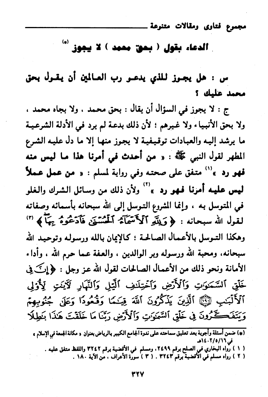 ج: لا يجوز في السؤال أن يقال: بحق محمد، ولا بجاه محمد، ولا بحق الأنبياء ولا غيرهم؛ لأن ذلك بدعة لم يرد في الأدلة الشرعية ما يرشد إليه والعبادات توقيفيه لا يجوز منها إلا ما دل عليه الشرع المطهر لقول النبي صلى الله عليه وسلم: «من أحدث في أمرنا هذا ما ليس منه فهو رد (¬1) » متفق على صحته وفي رواية لمسلم: «من عمل عملا ليس عليه أمرنا فهو رد (¬2) » ولأن ذلك من وسائل الشرك والغلو في المتوسل به، وإنما المشروع التوسل إلى الله سبحانه بأسمائه وصفاته لقول الله سبحانه: {وَلِلَّهِ الْأَسْمَاءُ الْحُسْنَى فَادْعُوهُ بِهَا} (¬3) وهكذا التوسل بالأعمال الصالحة؛ كالإيمان بالله ورسوله وتوحيد الله سبحانه، ومحبة الله ورسوله وبر الوالدين، والعفة عما حرم الله، وأداء الأمانة ونحو ذلك من الأعمال الصالحات لقول الله عز وجل: {إِنَّ فِي خَلْقِ السَّمَاوَاتِ وَالْأَرْضِ وَاخْتِلَافِ اللَّيْلِ وَالنَّهَارِ لَآيَاتٍ لِأُولِي الْأَلْبَابِ} (¬4) {الَّذِينَ يَذْكُرُونَ اللَّهَ قِيَامًا وَقُعُودًا وَعَلَى جُنُوبِهِمْ وَيَتَفَكَّرُونَ فِي خَلْقِ السَّمَاوَاتِ وَالْأَرْضِ رَبَّنَا مَا خَلَقْتَ هَذَا بَاطِلًا سُبْحَانَكَ فَقِنَا عَذَابَ النَّارِ} (¬5) {رَبَّنَا إِنَّكَ مَنْ تُدْخِلِ النَّارَ فَقَدْ أَخْزَيْتَهُ وَمَا لِلظَّالِمِينَ مِنْ أَنْصَارٍ} (¬6) {رَبَّنَا إِنَّنَا سَمِعْنَا مُنَادِيًا يُنَادِي لِلْإِيمَانِ أَنْ آمِنُوا بِرَبِّكُمْ فَآمَنَّا} (¬7)