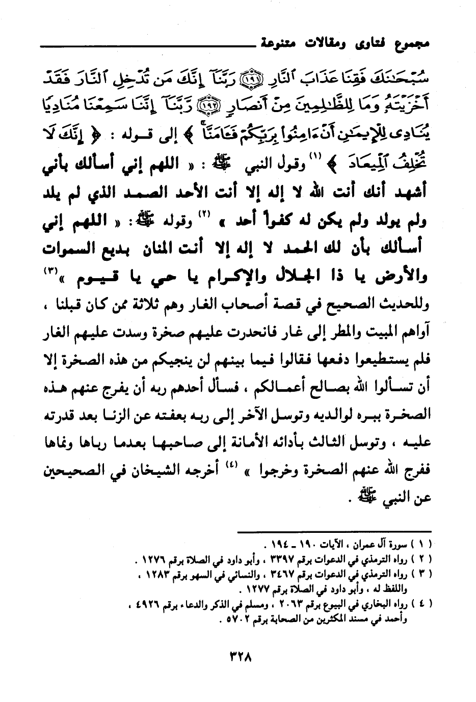 إلى قوله: {إِنَّكَ لَا تُخْلِفُ الْمِيعَادَ} (¬1) وقول النبي صلى الله عليه وسلم: «اللهم إني أسألك بأني أشهد أنك أنت الله لا إله إلا أنت الأحد الصمد الذي لم يلد ولم يولد ولم يكن له كفوا أحد (¬2) » وقوله صلى الله عليه وسلم: «اللهم إني أسألك بأن لك الحمد لا إله إلا أنت المنان بديع السماوات والأرض يا ذا الجلال والإكرام يا حي يا قيوم (¬3) » وللحديث الصحيح في قصة أصحاب الغار وهم ثلاثة ممن كان قبلنا آواهم المبيت والمطر إلى غار فانحدرت عليهم صخرة وسدت عليهم الغار فلم يستطيعوا دفعها فقالوا فيما بينهم: لن ينجيكم من هذه الصخرة إلا أن تسألوا الله بصالح أعمالكم فسأل أحدهم ربه أن يفرج عنهم هذه الصخرة ببره لوالديه وتوسل الآخر إلى ربه بعفته عن الزنا بعد قدرته عليه وتوسل الثالث بأدائه الأمانة إلى صاحبها بعدما رباها ونماها ففرج الله عنهم الصخرة وخرجوا أخرجه الشيخان في الصحيحين عن النبي صلى الله عليه وسلم.