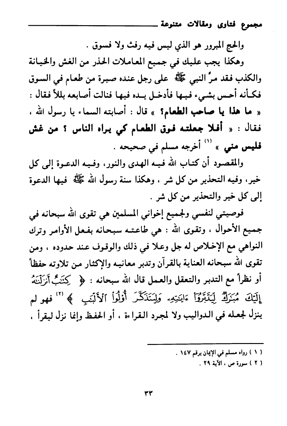 وهكذا يجب عليك في جميع المعاملات الحذر من الغش والخيانة والكذب فقد «مر النبي صلى الله عليه وسلم على رجل عنده صبرة من طعام في السوق فكأنه أحس بشيء فيها فأدخل يده فيها فنالت أصابعه بللا، فقال: ما هذا يا صاحب الطعام؟ قال: أصابته السماء يا رسول الله، فقال: أفلا جعلته فوق الطعام كي يراه الناس؟ من غش فليس مني (¬1) » أخرجه مسلم في صحيحه.