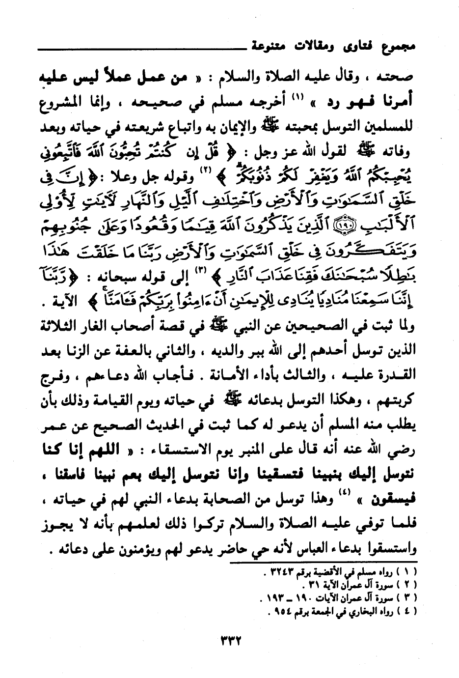 صحته. وقال عليه الصلاة والسلام: «من عمل عملا ليس عليه أمرنا فهو رد (¬1) » أخرجه مسلم في صحيحه، وإنما المشروع للمسلمين التوسل بمحبته صلى الله عليه وسلم والإيمان به واتباع شريعته في حياته وبعد وفاته صلى الله عليه وسلم لقول الله عز وجل: {قُلْ إِنْ كُنْتُمْ تُحِبُّونَ اللَّهَ فَاتَّبِعُونِي يُحْبِبْكُمُ اللَّهُ وَيَغْفِرْ لَكُمْ ذُنُوبَكُمْ} (¬2) وقوله جل وعلا: {إِنَّ فِي خَلْقِ السَّمَاوَاتِ وَالْأَرْضِ وَاخْتِلَافِ اللَّيْلِ وَالنَّهَارِ لَآيَاتٍ لِأُولِي الْأَلْبَابِ} (¬3) {الَّذِينَ يَذْكُرُونَ اللَّهَ قِيَامًا وَقُعُودًا وَعَلَى جُنُوبِهِمْ وَيَتَفَكَّرُونَ فِي خَلْقِ السَّمَاوَاتِ وَالْأَرْضِ رَبَّنَا مَا خَلَقْتَ هَذَا بَاطِلًا سُبْحَانَكَ فَقِنَا عَذَابَ النَّارِ} (¬4) إلى قوله سبحانه: {رَبَّنَا إِنَّنَا سَمِعْنَا مُنَادِيًا يُنَادِي لِلْإِيمَانِ أَنْ آمِنُوا بِرَبِّكُمْ فَآمَنَّا} (¬5) الآية.