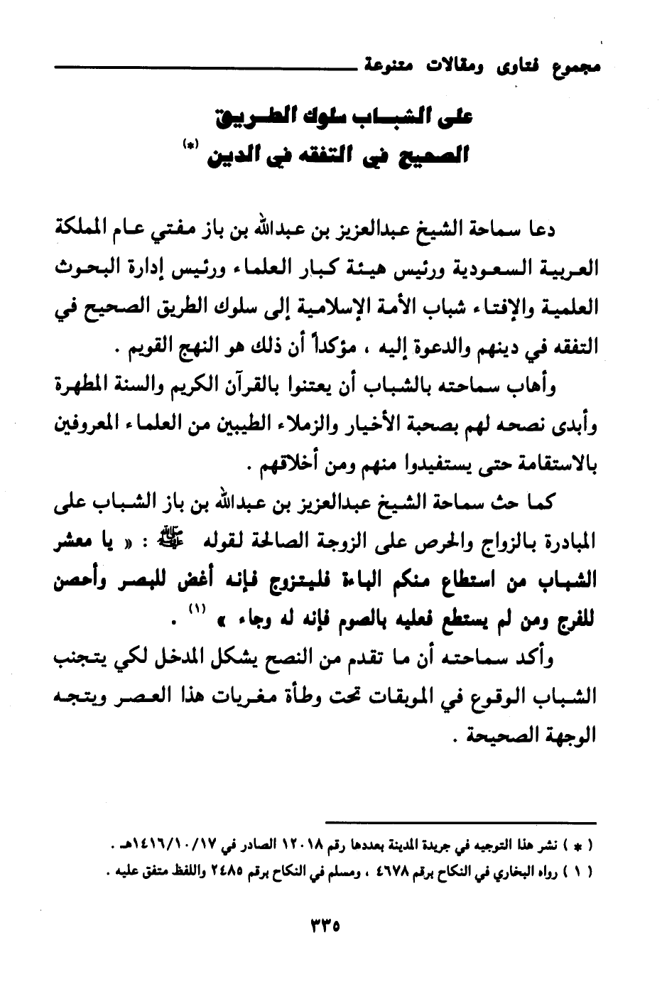 دعا سماحة الشيخ عبد العزيز بن عبد الله بن باز مفتي عام المملكة العربية السعودية ورئيس هيئة كبار العلماء ورئيس إدارة البحوث العلمية والإفتاء شباب الأمة الإسلامية إلى سلوك الطريق الصحيح في التفقه في دينهم والدعوة إليه، مؤكدا أن ذلك هو النهج القويم.
