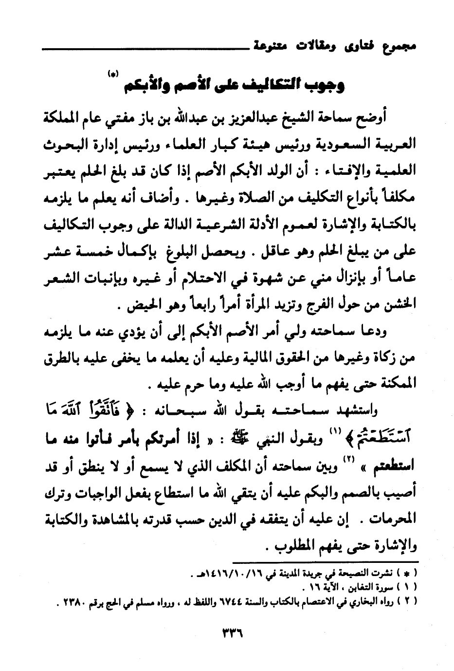واستشهد سماحته بقول الله سبحانه: {فَاتَّقُوا اللَّهَ مَا اسْتَطَعْتُمْ} (¬1) وبقول النبي صلى الله عليه وسلم: «إذا أمرتكم بأمر فأتوا منه ما استطعتم (¬2) » وبين سماحته أن المكلف الذي لا يسمع أو لا ينطق أو قد أصيب بالصمم والبكم عليه أن يتقي الله ما استطاع بفعل الواجبات وترك المحرمات. إن عليه أن يتفقه في الدين حسب قدرته بالمشاهدة والكتابة والإشارة حتى يفهم المطلوب.