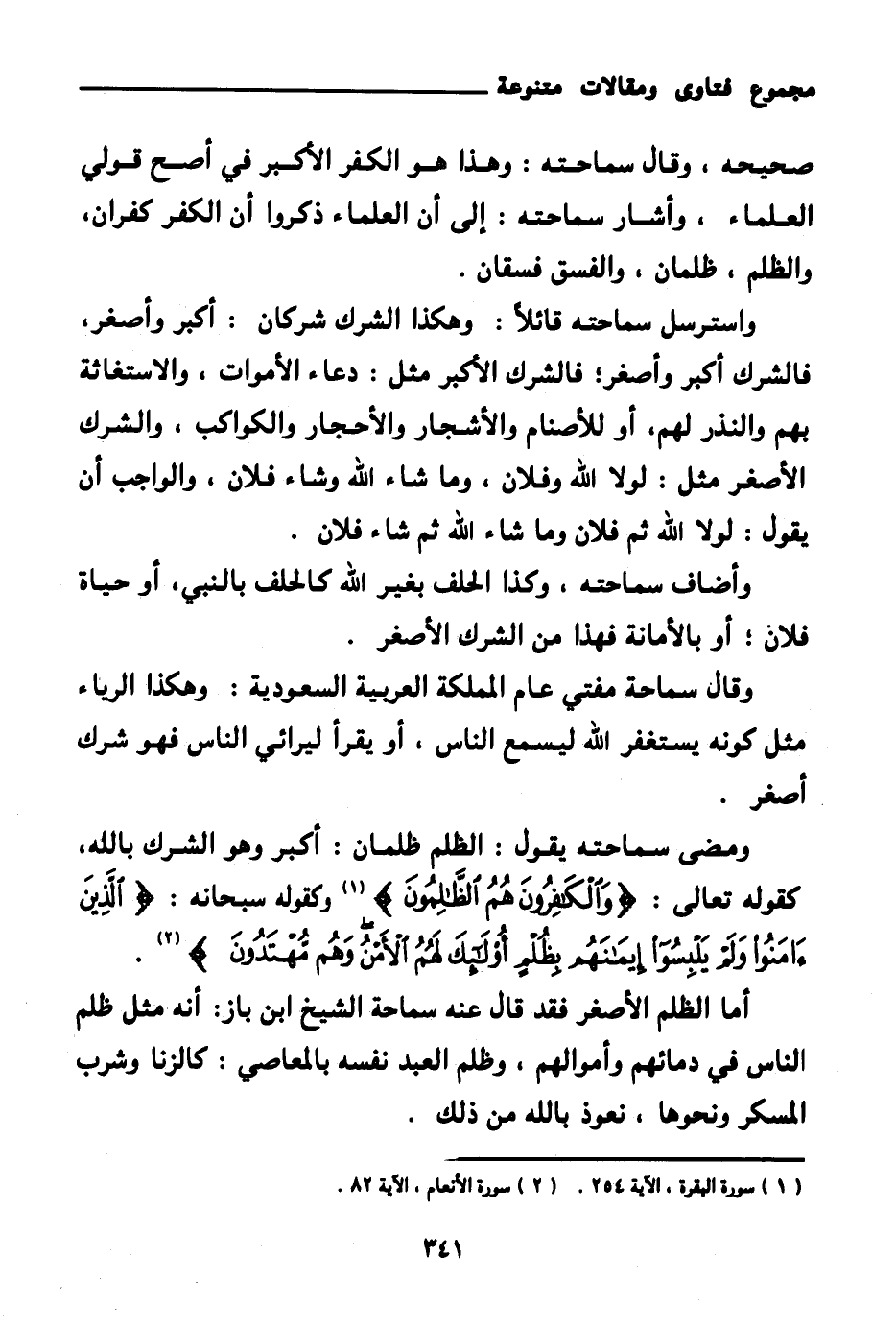 واسترسل سماحته قائلا: وهكذا الشرك شركان: أكبر وأصغر، فالشرك أكبر وأصغر؛ فالشرك الأكبر مثل: دعاء الأموات، والاستغاثة بهم والنذر لهم، أو للأصنام والأشجار والأحجار والكواكب، والشرك الأصغر مثل: لولا الله وفلان، وما شاء الله وشاء فلان، والواجب أن يقول: لولا الله ثم فلان وما شاء الله ثم شاء فلان.