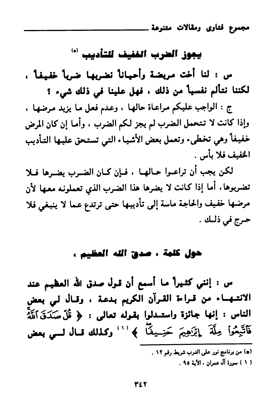 لكن يجب أن تراعوا حالها، فإن كان الضرب يضرها فلا تضربوها، أما إذا كانت لا يضرها هذا الضرب الذي تعملونه معها لأن مرضها خفيف والحاجة ماسة إلى تأديبها حتى ترتدع عما لا ينبغي فلا حرج في ذلك.