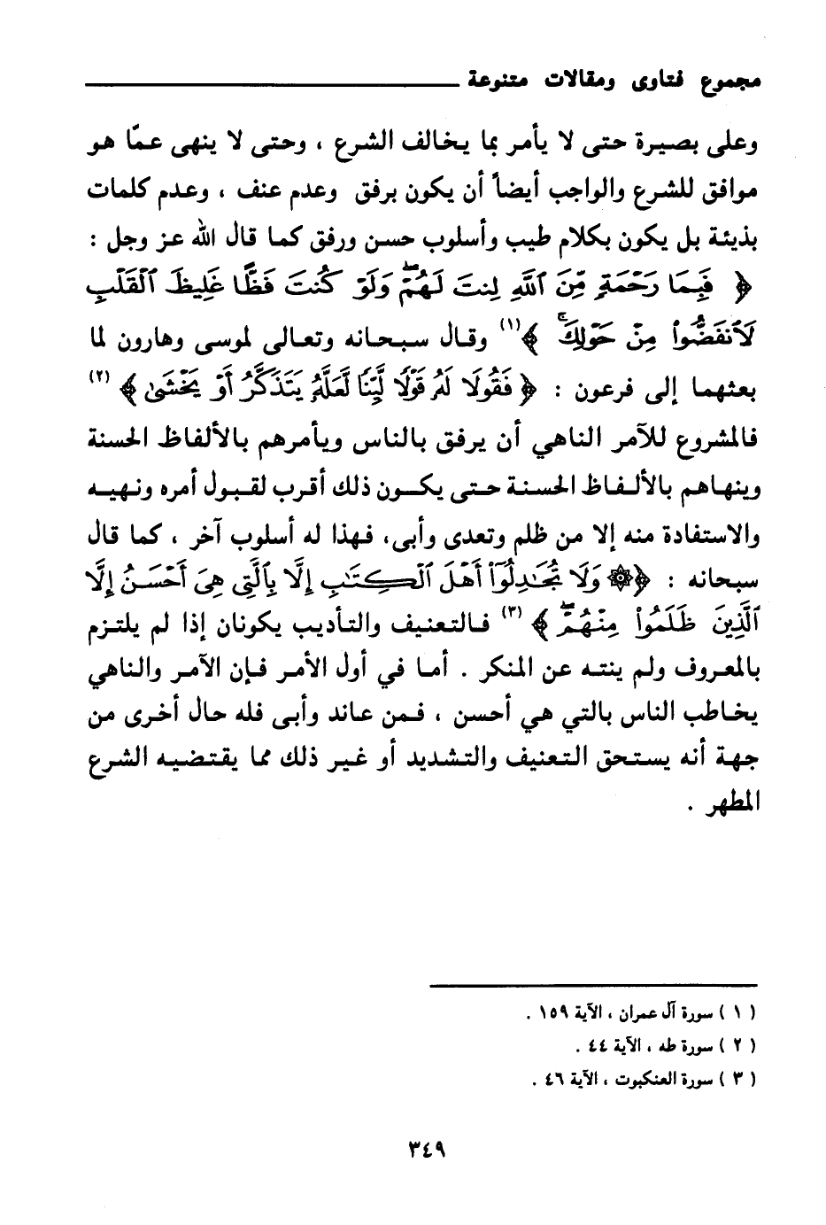 وعلى بصيرة حتى لا يأمر بما يخالف الشرع، وحتى لا ينهى عما هو موافق للشرع والواجب أيضا أن يكون برفق وعدم عنف، وعدم كلمات بذيئة بل يكون بكلام طيب وأسلوب حسن ورفق كما قال الله عز وجل: {فَبِمَا رَحْمَةٍ مِنَ اللَّهِ لِنْتَ لَهُمْ وَلَوْ كُنْتَ فَظًّا غَلِيظَ الْقَلْبِ لَانْفَضُّوا مِنْ حَوْلِكَ} (¬1) وقال سبحانه وتعالى لموسى وهارون لما بعثهما إلى فرعون: {فَقُولَا لَهُ قَوْلًا لَيِّنًا لَعَلَّهُ يَتَذَكَّرُ أَوْ يَخْشَى} (¬2) فالمشروع للآمر الناهي أن يرفق بالناس ويأمرهم بالألفاظ الحسنة وينهاهم بالألفاظ الحسنة حتى يكون ذلك أقرب لقبول أمره ونهيه والاستفادة منه إلا من ظلم وتعدى وأبى، فهذا له أسلوب آخر، كما قال سبحانه: {وَلَا تُجَادِلُوا أَهْلَ الْكِتَابِ إِلَّا بِالَّتِي هِيَ أَحْسَنُ إِلَّا الَّذِينَ ظَلَمُوا مِنْهُمْ} (¬3) فالتعنيف والتأديب يكونان إذا لم يلتزم بالمعروف ولم ينته عن المنكر. أما في أول الأمر فإن الآمر والناهي يخاطب الناس بالتي هي أحسن، فمن عاند وأبى فله حال أخرى من جهة أنه يستحق التعنيف والتشديد أو غير ذلك مما يقتضيه الشرع المطهر.