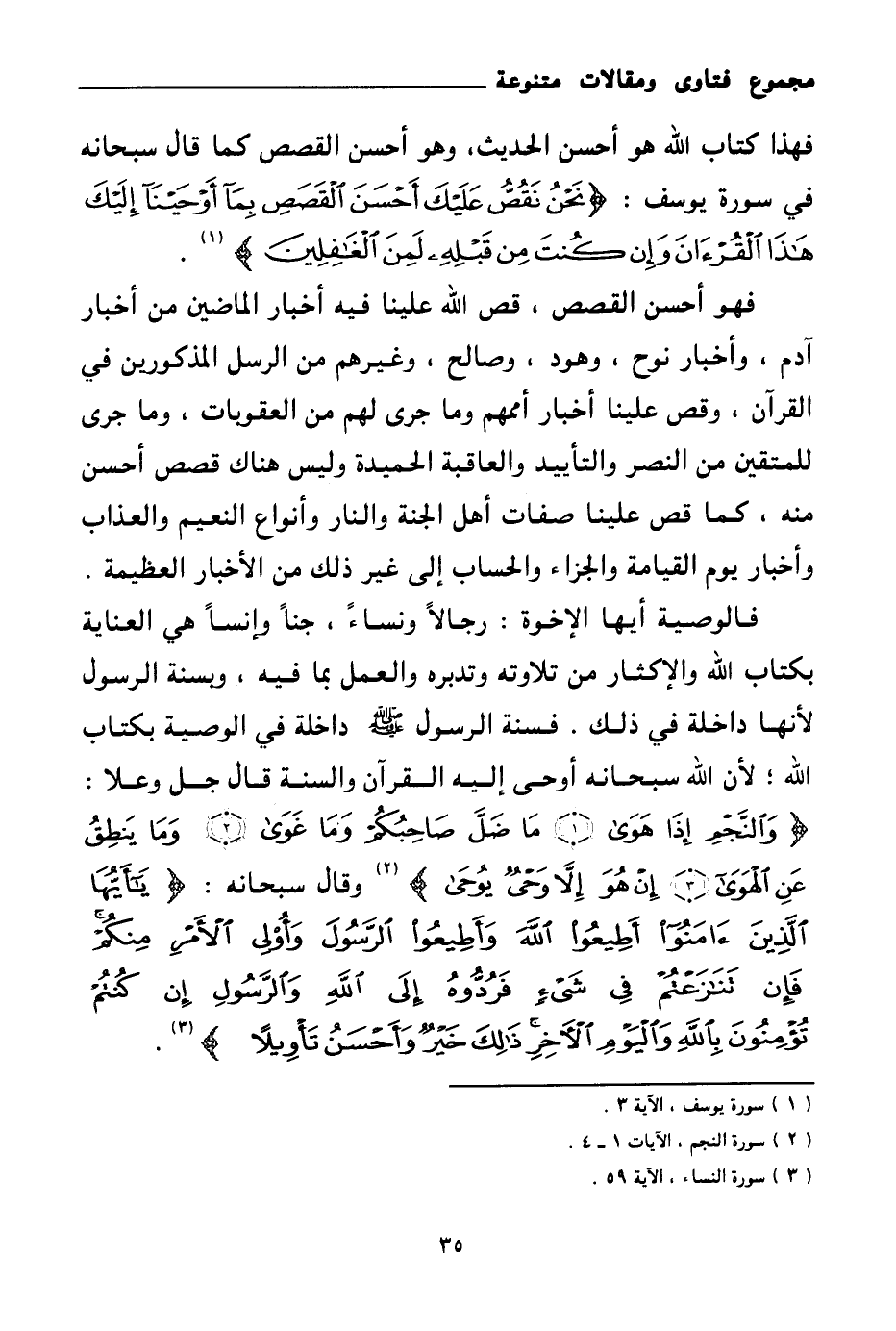 فهذا كتاب الله هو أحسن الحديث، وهو أحسن القصص كما قال سبحانه في سورة يوسف: {نَحْنُ نَقُصُّ عَلَيْكَ أَحْسَنَ الْقَصَصِ بِمَا أَوْحَيْنَا إِلَيْكَ هَذَا الْقُرْآنَ وَإِنْ كُنْتَ مِنْ قَبْلِهِ لَمِنَ الْغَافِلِينَ} (¬1)