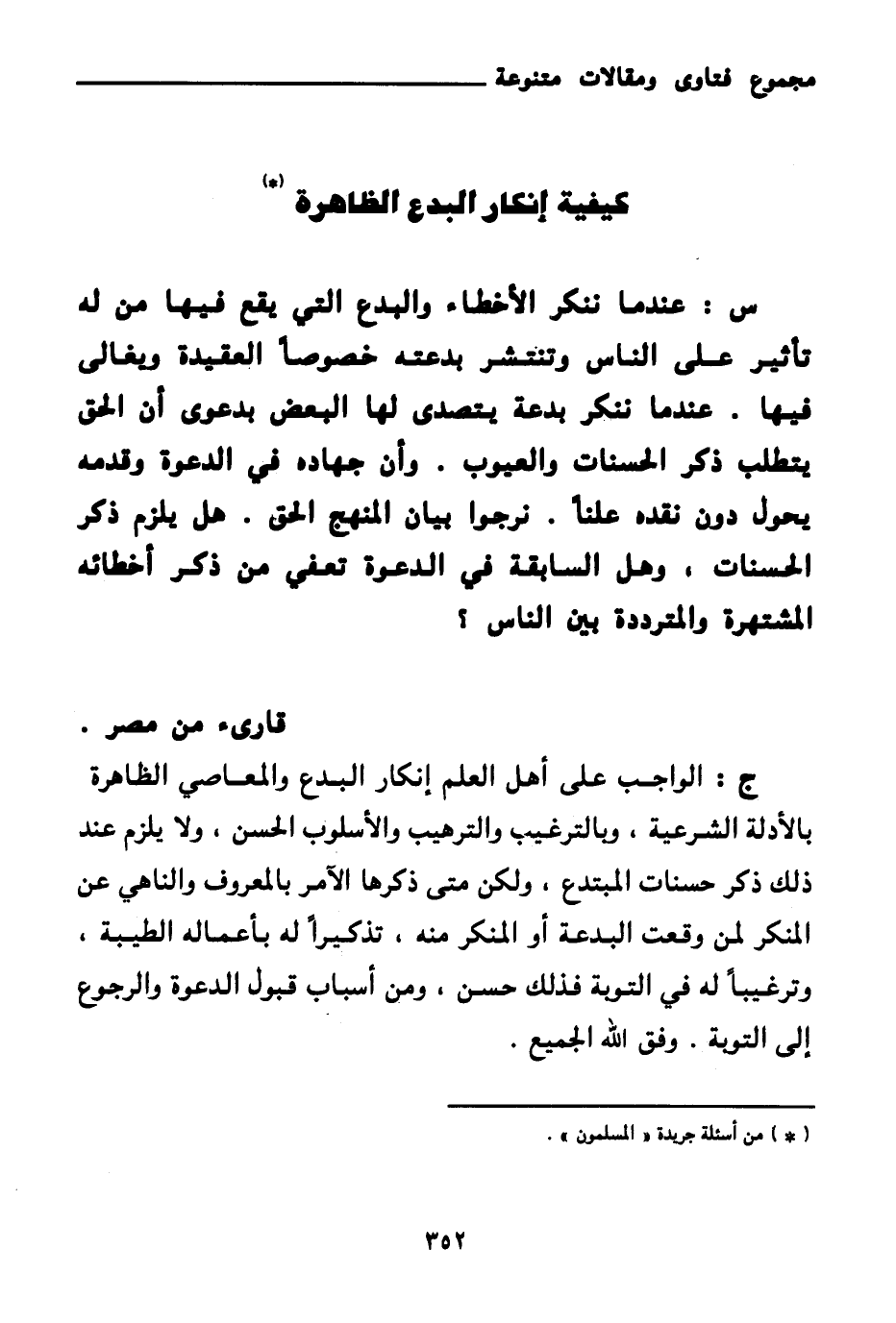 س: عندما ننكر الأخطاء والبدع التي يقع فيها من له تأثير على الناس وتنتشر بدعته خصوصا العقيدة ويغالي فيها. عندما ننكر بدعة يتصدى لها البعض بدعوى أن الحق يتطلب ذكر الحسنات والعيوب. وأن جهاده في الدعوة وقدمه يحول دون نقده علنا. نرجوا بيان المنهج الحق. هل يلزم ذكر الحسنات، وهل السابقة في الدعوة تعفي من ذكر أخطائه المشتهرة والمترددة بين الناس؟ قارئ من مصر.