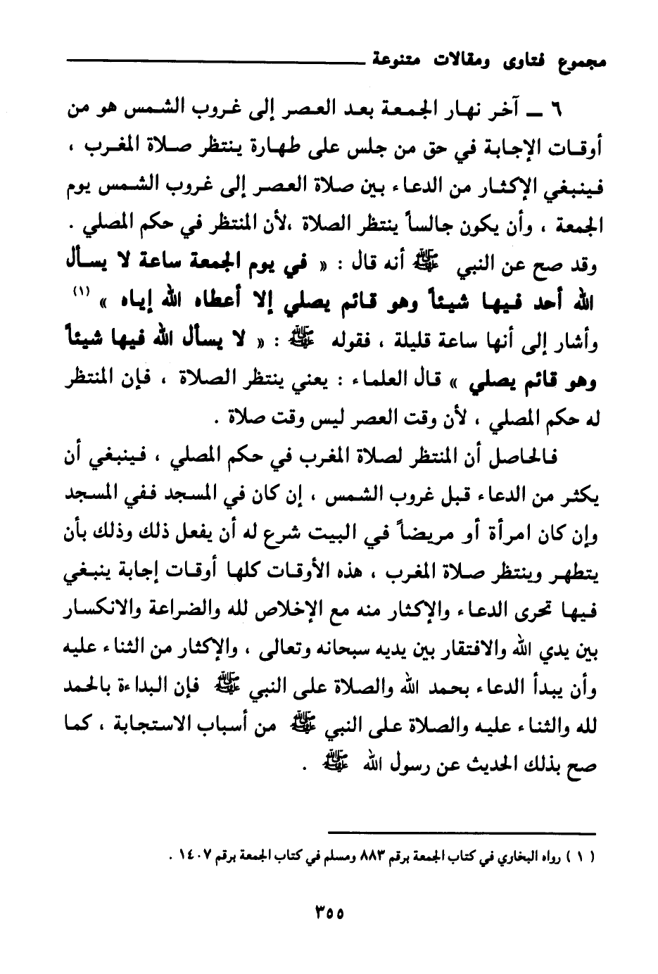 6 - آخر نهار الجمعة بعد العصر إلى غروب الشمس هو من أوقات الإجابة في حق من جلس على طهارة ينتظر صلاة المغرب، فينبغي الإكثار من الدعاء بين صلاة العصر إلى غروب الشمس يوم الجمعة، وأن يكون جالسا ينتظر الصلاة؛ لأن المنتظر في حكم المصلي. وقد صح عن النبي صلى الله عليه وسلم أنه قال: «في يوم الجمعة ساعة لا يسأل الله أحد فيها شيئا وهو قائم يصلي إلا أعطاه الله إياه (¬1) » وأشار إلى أنها ساعة قليلة، فقوله صلى الله عليه وسلم: «لا يسأل الله فيها شيئا وهو قائم يصلي (¬2) » قال العلماء: يعني ينتظر الصلاة، فإن المنتظر له حكم المصلي؛ لأن وقت العصر ليس وقت صلاة.