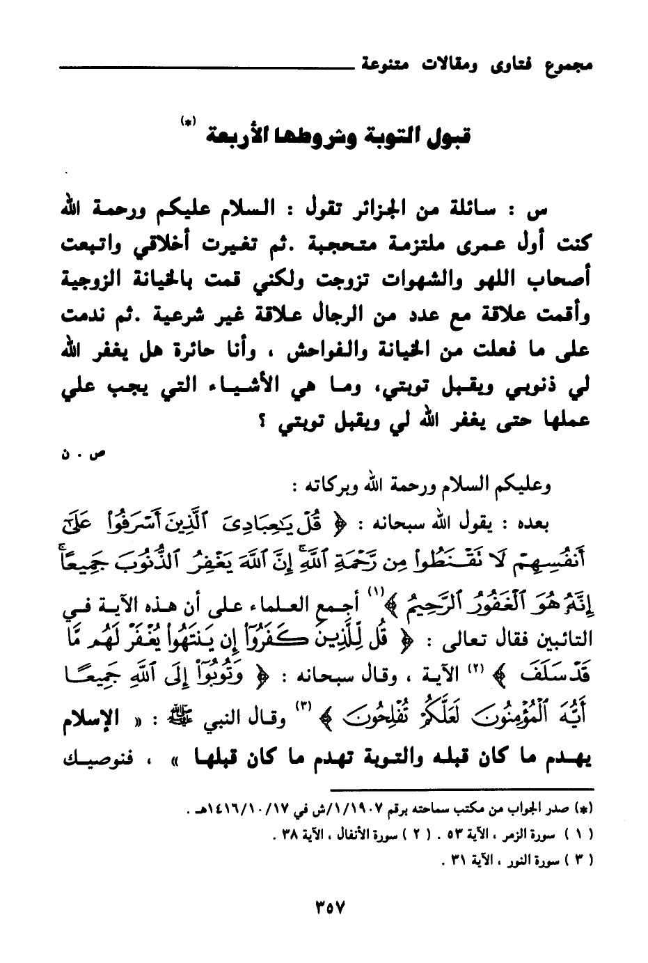 س: سائلة من الجزائر تقول: السلام عليكم ورحمة الله كنت أول عمري ملتزمة متحجبة. ثم تغيرت أخلاقي واتبعت أصحاب اللهو والشهوات تزوجت ولكني قمت بالخيانة الزوجية وأقمت علاقة مع عدد من الرجال علاقة غير شرعية. ثم ندمت على ما فعلت من الخيانة والفواحش، وأنا حائرة هل يغفر الله لي ذنوبي ويقبل توبتي، وما هي الأشياء التي يجب علي عملها حتى يغفر الله لي ويقبل توبتي؟