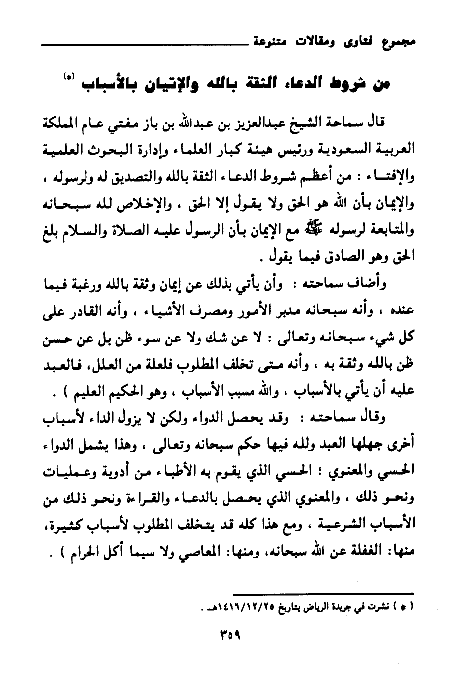 قال سماحة الشيخ عبد العزيز بن عبد الله بن باز مفتي عام المملكة العربية السعودية ورئيس هيئة كبار العلماء وإدارة البحوث العلمية والإفتاء: من أعظم شروط الدعاء الثقة بالله والتصديق له ولرسوله، والإيمان بأن الله هو الحق ولا يقول إلا الحق، والإخلاص لله سبحانه والمتابعة لرسوله صلى الله عليه وسلم مع الإيمان بأن الرسول عليه الصلاة والسلام بلغ الحق وهو الصادق فيما يقول.