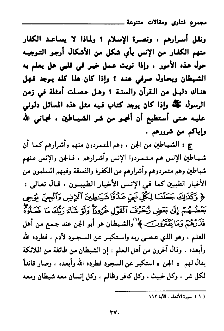 ج: الشياطين من الجن، وهم المتمردون منهم وأشرارهم كما أن شياطين الإنس هم متمردو الإنس وأشرارهم، فالجن والإنس منهم شياطين وهم متمردوهم وأشرارهم من الكفرة والفسقة وفيهم المسلمون من الأخيار الطيبين كما في الإنس الأخيار الطيبون. قال تعالى: {وَكَذَلِكَ جَعَلْنَا لِكُلِّ نَبِيٍّ عَدُوًّا شَيَاطِينَ الْإِنْسِ وَالْجِنِّ يُوحِي بَعْضُهُمْ إِلَى بَعْضٍ زُخْرُفَ الْقَوْلِ غُرُورًا وَلَوْ شَاءَ رَبُّكَ مَا فَعَلُوهُ فَذَرْهُمْ وَمَا يَفْتَرُونَ} (¬1) والشيطان هو أبو الجن عند جمع من أهل العلم، وهو الذي عصى ربه واستكبر عن السجود لآدم، فطرده الله وأبعده. وقال آخرون من أهل العلم: إن الشيطان من طائفة من الملائكة يقال لهم الجن استكبر عن السجود فطرده الله وأبعده، وصار قائدا لكل شر، وكل خبيث، وكل كافر وظالم، وكل إنسان معه شيطان ومعه