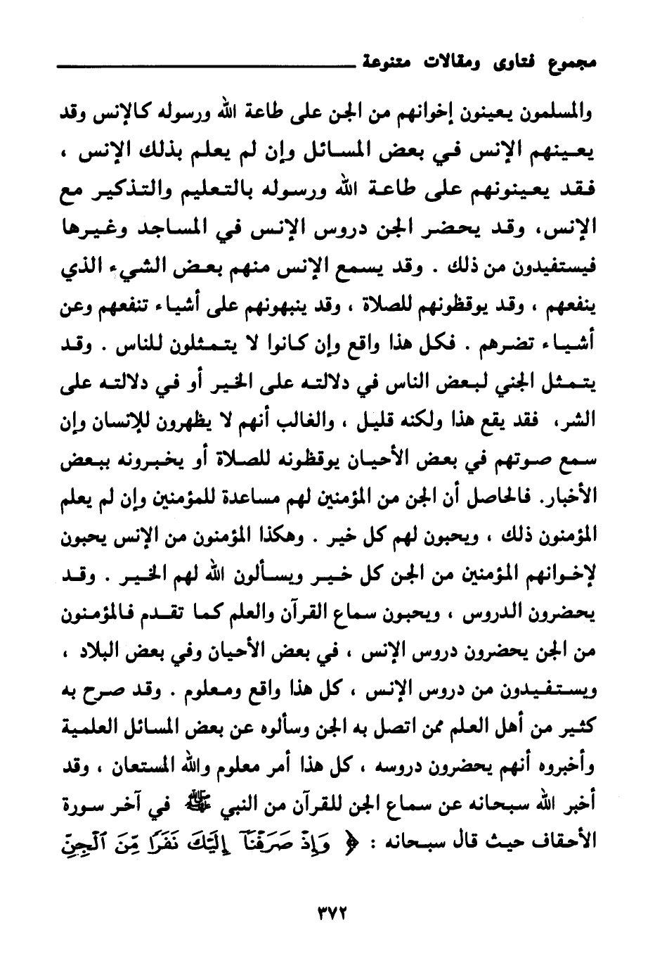 والمسلمون يعينون إخوانهم من الجن على طاعة الله ورسوله كالإنس وقد يعينهم الإنس في بعض المسائل وإن لم يعلم بذلك الإنس، فقد يعينونهم على طاعة الله ورسوله بالتعليم والتذكير مع الإنس، وقد يحضر الجن دروس الإنس في المساجد وغيرها فيستفيدون من ذلك. وقد يسمع الإنس منهم بعض الشيء الذي ينفعهم، وقد يوقظونهم للصلاة، وقد ينبهونهم على أشياء تنفعهم وعن أشياء تضرهم. فكل هذا واقع وإن كانوا لا يتمثلون للناس. وقد يتمثل الجني لبعض الناس في دلالته على الخير أو في دلالته على الشر، فقد يقع هذا ولكنه قليل، والغالب أنهم لا يظهرون للإنسان وإن سمع صوتهم في بعض الأحيان يوقظونه للصلاة أو يخبرونه ببعض الأخبار. فالحاصل أن الجن من المؤمنين لهم مساعدة للمؤمنين وإن لم يعلم المؤمنون ذلك، ويحبون لهم كل خير. وهكذا المؤمنون من الإنس يحبون لإخوانهم المؤمنين من الجن كل خير ويسألون الله لهم الخير. وقد يحضرون الدروس، ويحبون سماع القرآن والعلم كما تقدم فالمؤمنون من الجن يحضرون دروس الإنس، في بعض الأحيان وفي بعض البلاد، ويستفيدون من دروس الإنس، كل هذا واقع ومعلوم. وقد صرح به كثير من أهل العلم ممن اتصل به الجن وسألوه عن بعض المسائل العلمية وأخبروه أنهم يحضرون دروسه، كل هذا أمر معلوم والله المستعان، وقد أخبر الله سبحانه عن سماع الجن للقرآن من النبي صلى الله عليه وسلم في آخر سورة الأحقاف حيث قال سبحانه: {وَإِذْ صَرَفْنَا إِلَيْكَ نَفَرًا مِنَ الْجِنِّ يَسْتَمِعُونَ الْقُرْآنَ فَلَمَّا حَضَرُوهُ قَالُوا أَنْصِتُوا فَلَمَّا قُضِيَ وَلَّوْا إِلَى قَوْمِهِمْ مُنْذِرِينَ} (¬1) {قَالُوا يَا قَوْمَنَا إِنَّا سَمِعْنَا كِتَابًا أُنْزِلَ مِنْ بَعْدِ مُوسَى مُصَدِّقًا لِمَا بَيْنَ يَدَيْهِ يَهْدِي إِلَى الْحَقِّ وَإِلَى طَرِيقٍ مُسْتَقِيمٍ} (¬2)