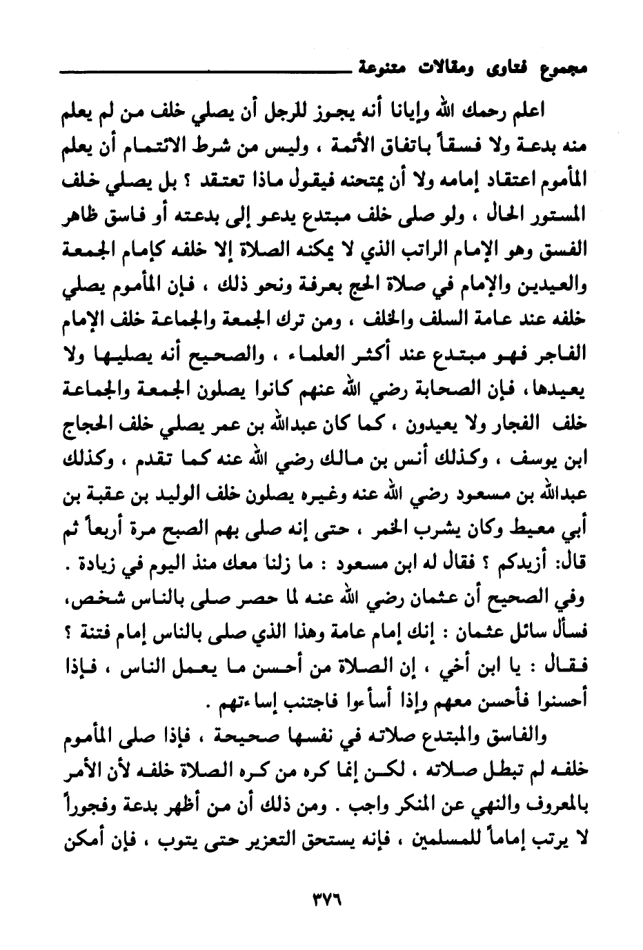 اعلم رحمك الله وإيانا أنه يجوز للرجل أن يصلي خلف من لم يعلم منه بدعة ولا فسقا باتفاق الأئمة، وليس من شرط الائتمام أن يعلم المأموم اعتقاد إمامه ولا أن يمتحنه فيقول ماذا تعتقد؟ بل يصلي خلف المستور الحال، ولو صلى خلف مبتدع يدعو إلى بدعته أو فاسق ظاهر الفسق وهو الإمام الراتب الذي لا يمكنه الصلاة إلا خلفه كإمام الجمعة والعيدين والإمام في صلاة الحج بعرفة ونحو ذلك، فإن المأموم يصلي خلفه عند عامة السلف والخلف، ومن ترك الجمعة والجماعة خلف الإمام الفاجر فهو مبتدع عند أكثر العلماء، والصحيح أنه يصليها ولا يعيدها، فإن الصحابة رضي الله عنهم كانوا يصلون الجمعة والجماعة خلف الفجار ولا يعيدون، كما كان عبد الله بن عمر يصلي خلف الحجاج ابن يوسف، وكذلك أنس بن مالك رضي الله عنه كما تقدم، وكذلك عبد الله بن مسعود رضي الله عنه وغيره يصلون خلف الوليد بن عقبة بن أبي معيط وكان يشرب الخمر، حتى إنه صلى بهم الصبح مرة أربعا ثم قال: أزيدكم؟ فقال له ابن مسعود: ما زلنا معك منذ اليوم في زيادة. وفي الصحيح أن عثمان رضي الله عنه لما حصر صلى بالناس شخص، فسأل سائل عثمان: إنك إمام عامة وهذا الذي صلى بالناس إمام فتنة؟ فقال: يا ابن أخي، إن الصلاة من أحسن ما يعمل الناس، فإذا أحسنوا فأحسن معهم وإذا أسأءوا فاجتنب إساءتهم.