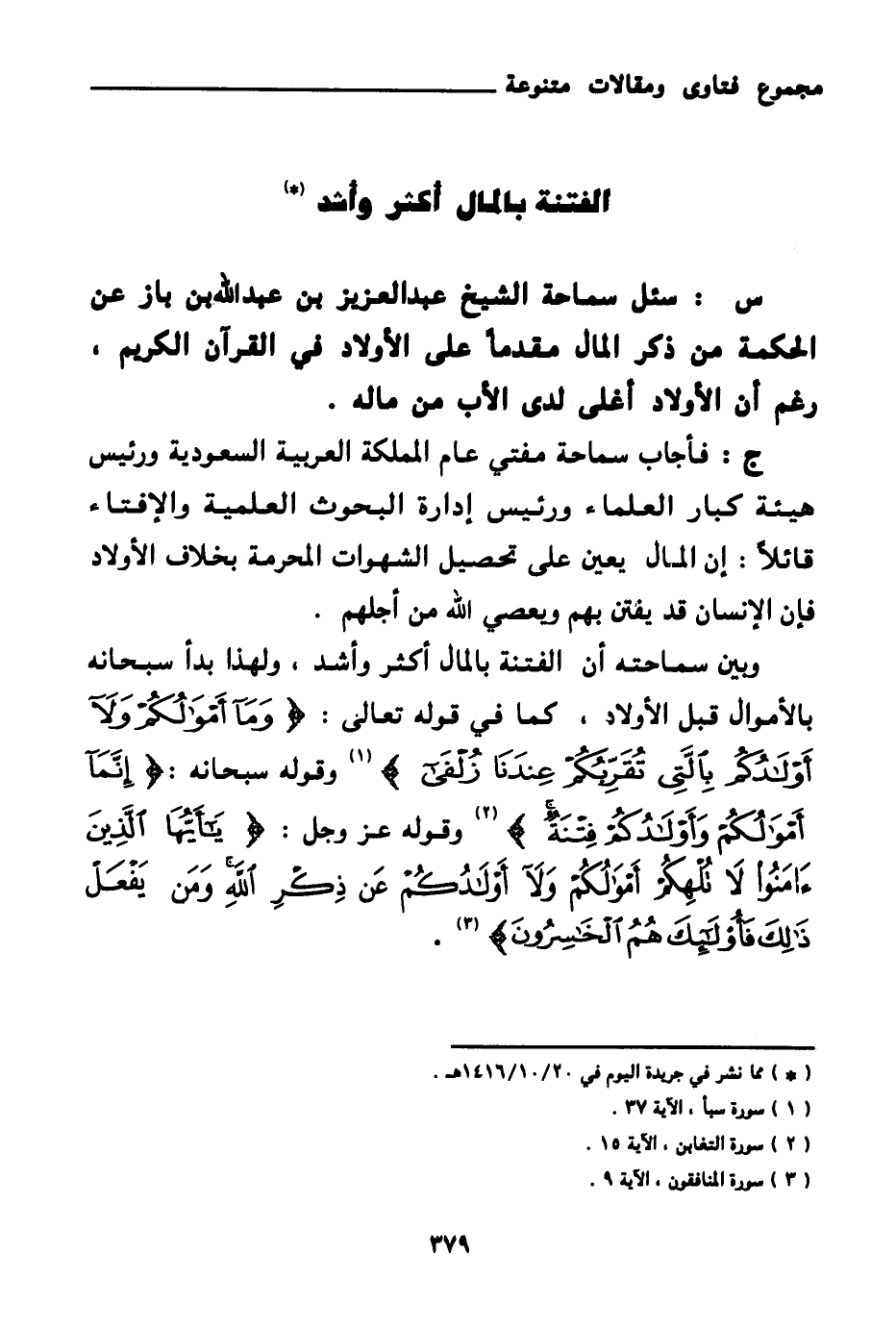 وبين سماحته أن الفتنة بالمال أكثر وأشد، ولهذا بدأ سبحانه بالأموال قبل الأولاد، كما في قوله تعالى: {وَمَا أَمْوَالُكُمْ وَلَا أَوْلَادُكُمْ بِالَّتِي تُقَرِّبُكُمْ عِنْدَنَا زُلْفَى} (¬1) وقوله سبحانه: {إِنَّمَا أَمْوَالُكُمْ وَأَوْلَادُكُمْ فِتْنَةٌ} (¬2) وقوله عز وجل: {يَا أَيُّهَا الَّذِينَ آمَنُوا لَا تُلْهِكُمْ أَمْوَالُكُمْ وَلَا أَوْلَادُكُمْ عَنْ ذِكْرِ اللَّهِ وَمَنْ يَفْعَلْ ذَلِكَ فَأُولَئِكَ هُمُ الْخَاسِرُونَ} (¬3)