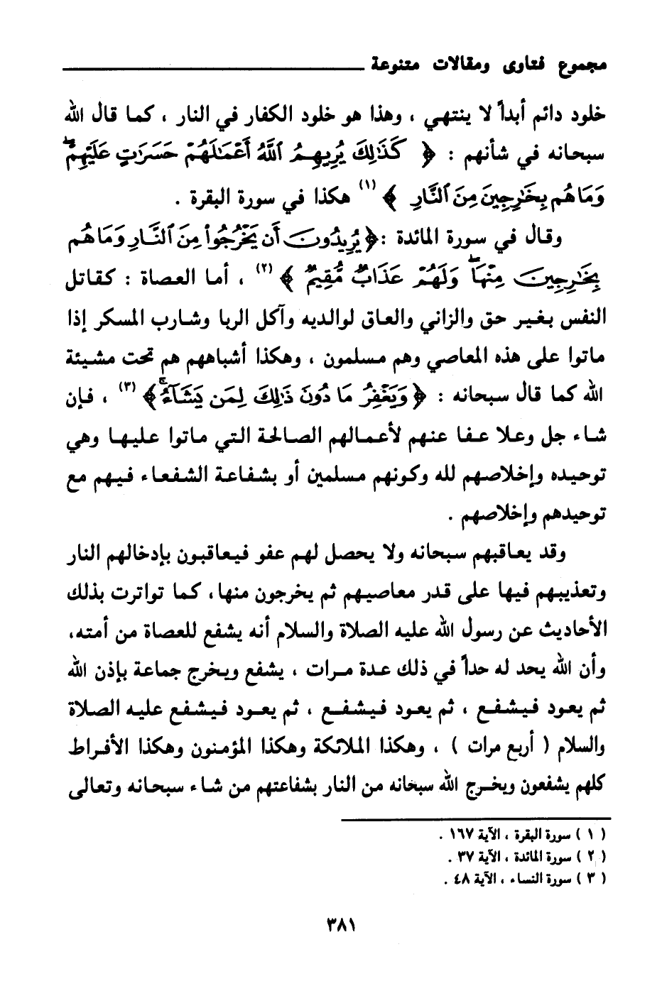 وقال في سورة المائدة: {يُرِيدُونَ أَنْ يَخْرُجُوا مِنَ النَّارِ وَمَا هُمْ بِخَارِجِينَ مِنْهَا وَلَهُمْ عَذَابٌ مُقِيمٌ} (¬2) أما العصاة: كقاتل النفس بغير حق والزاني والعاق لوالديه وآكل الربا وشارب المسكر إذا ماتوا على هذه المعاصي وهم مسلمون، وهكذا أشباههم هم تحت مشيئة الله كما قال سبحانه: {وَيَغْفِرُ مَا دُونَ ذَلِكَ لِمَنْ يَشَاءُ} (¬3) فإن شاء جل وعلا عفا عنهم لأعمالهم الصالحة التي ماتوا عليها وهي توحيده وإخلاصهم لله وكونهم مسلمين أو بشفاعة الشفعاء فيهم مع توحيدهم وإخلاصهم.