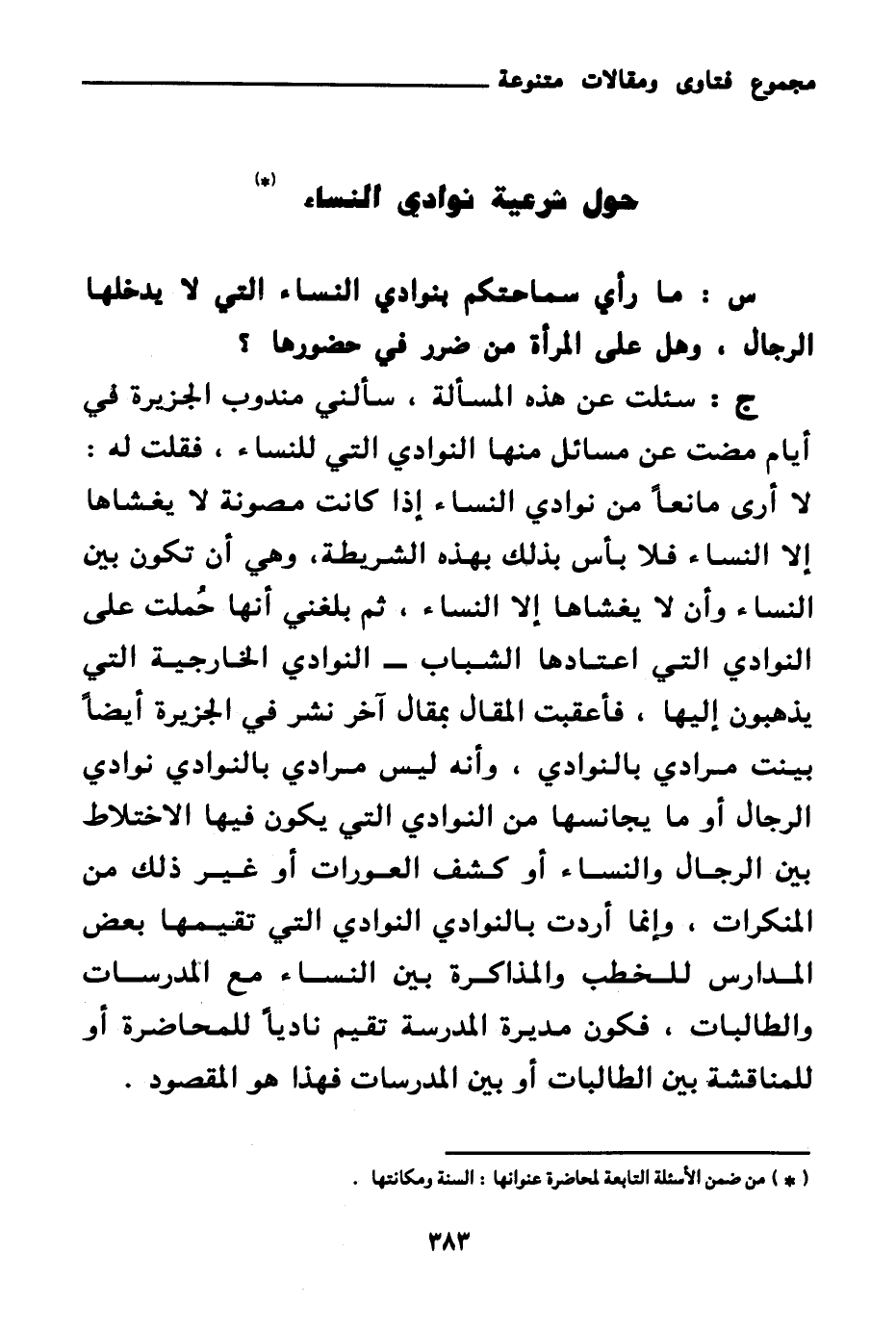 ج: سئلت عن هذه المسألة، سألني مندوب الجزيرة في أيام مضت عن مسائل منها النوادي التي للنساء، فقلت له: لا أرى مانعا من نوادي النساء إذا كانت مصونة لا يغشاها إلا النساء فلا بأس بذلك بهذه الشريطة، وهي أن تكون بين النساء وأن لا يغشاها إلا النساء، ثم بلغني أنها حملت على النوادي التي اعتادها الشباب - النوادي الخارجية التي يذهبون إليها، فأعقبت المقال بمقال آخر نشر في الجزيرة أيضا بينت مرادي بالنوادي، وأنه ليس مرادي بالنوادي نوادي الرجال أو ما يجانسها من النوادي التي يكون فيها الاختلاط بين الرجال والنساء أو كشف العورات أو غير ذلك من المنكرات، وإنما أردت بالنوادي النوادي التي تقيمها بعض المدارس للخطب والمذاكرة بين النساء مع المدرسات والطالبات، فكون مديرة المدرسة تقيم ناديا للمحاضرة أو للمناقشة بين الطالبات أو بين المدرسات فهذا هو المقصود.