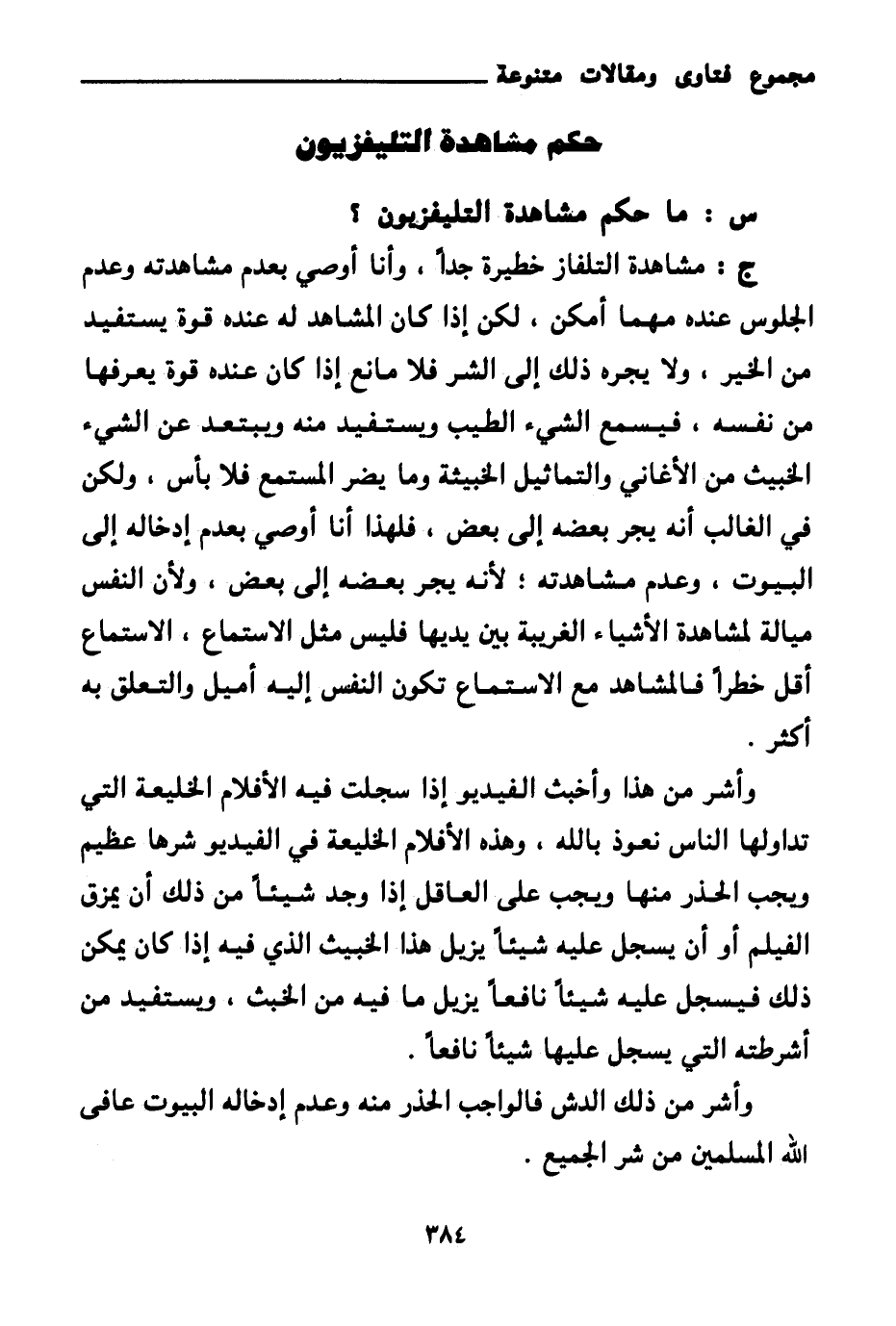 ج: مشاهدة التلفاز خطيرة جدا، وأنا أوصي بعدم مشاهدته وعدم الجلوس عنده مهما أمكن، لكن إذا كان المشاهد له عنده قوه يستفيد من الخير، ولا يجره ذلك إلى الشر فلا مانع إذا كان عنده قوة يعرفها من نفسه، فيسمع الشيء الطيب ويستفيد منه ويبتعد عن الشيء الخبيث من الأغاني والتماثيل الخبيثة وما يضر المستمع فلا بأس، ولكن في الغالب أنه يجر بعضه إلى بعض، فلهذا أنا أوصي بعدم أدخاله إلى البيوت، وعدم مشاهدته؛ لأنه يجر بعضه إلى بعض، ولأن النفس ميالة لمشاهدة الأشياء الغريبة بين يديها فليس مثل الاستماع، الاستماع أقل خطرا فالمشاهد مع الاستماع تكون النفس إليه أميل والتعلق به أكثر.