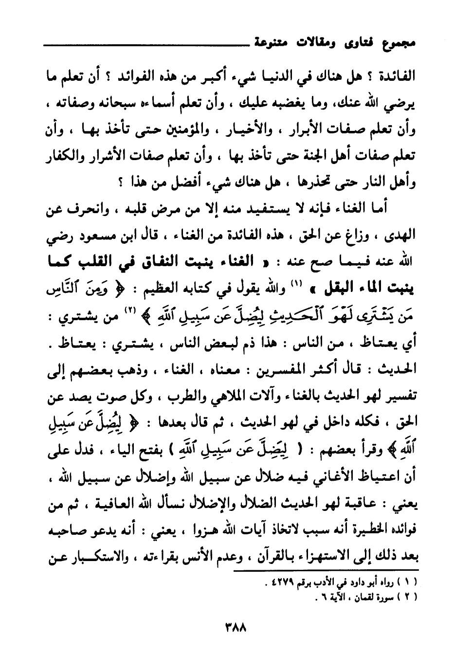 قال ابن مسعود رضي الله عنه فيما صح عنه: الغناء ينبت النفاق في القلب كما ينبت الماء البقل (¬1) والله يقول في كتابه العظيم: {وَمِنَ النَّاسِ مَنْ يَشْتَرِي لَهْوَ الْحَدِيثِ لِيُضِلَّ عَنْ سَبِيلِ اللَّهِ} (¬2)