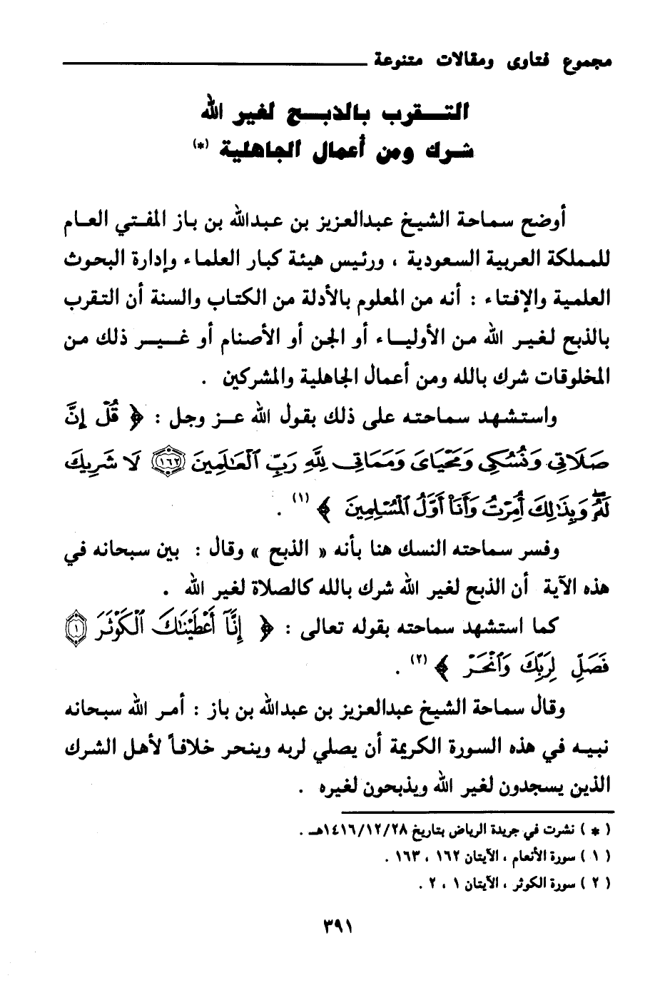 أوضح سماحة الشيخ عبد العزيز بن عبد الله بن باز المفتي العام للمملكة العربية السعودية، ورئيس هيئة كبار العلماء وإدارة البحوث العلمية والإفتاء: أنه من المعلوم بالأدلة من الكتاب والسنة أن التقرب بالذبح لغير الله من الأولياء أو الجن أو الأصنام أو غير ذلك من المخلوقات شرك بالله ومن أعمال الجاهلية والمشركين.