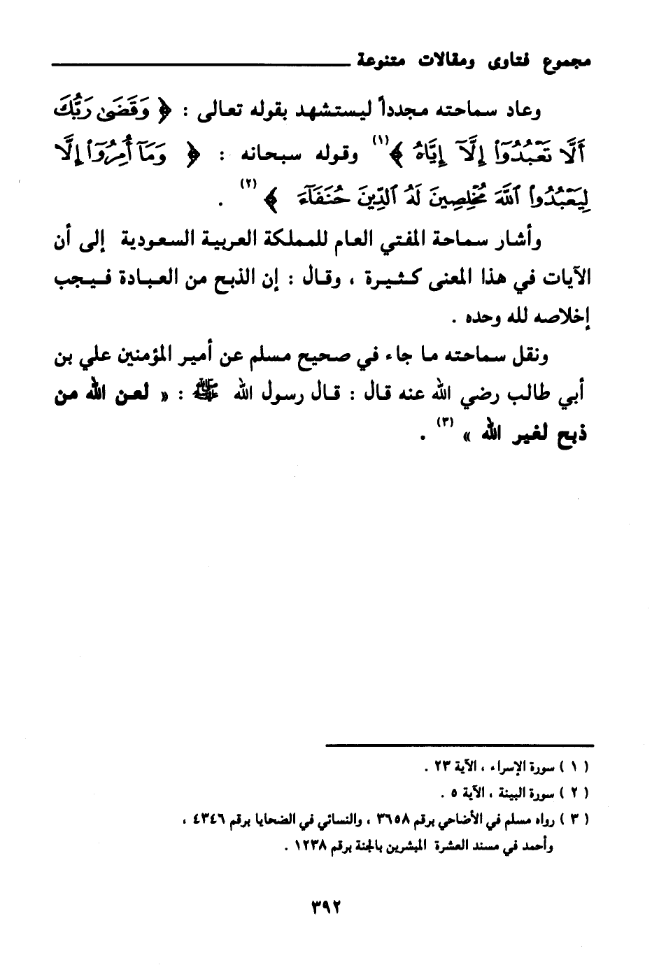 وأشار سماحة المفتي العام للمملكة العربية السعودية إلى أن الآيات في هذا المعنى كثيرة. وقال: أن الذبح من العبادة فيجب إخلاصه لله وحده.