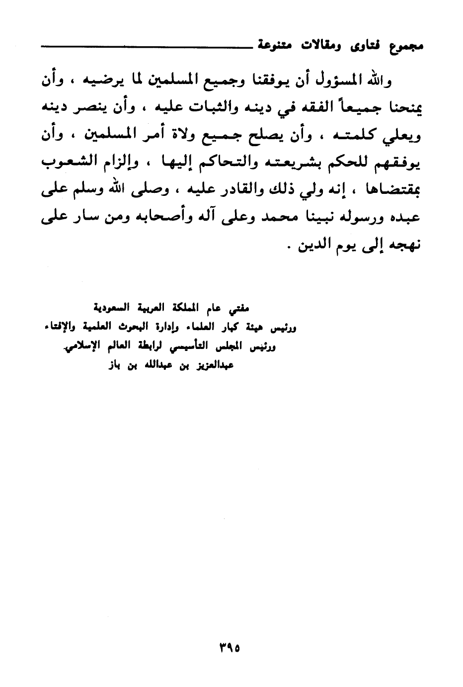 والله المسئول أن يوفقنا وجميع المسلمين لما يرضيه، وأن يمنحنا جميعا الفقه في دينه والثبات عليه، وأن ينصر دينه ويعلي كلمته، وأن يصلح جميع ولاة أمر المسلمين، وأن يوفقهم للحكم بشريعته والتحاكم إليها، وإلزام الشعوب بمقتضاها، إنه ولي ذلك والقادر عليه، وصلى الله وسلم على عبده ورسوله نبينا محمد وعلى آله وأصحابه ومن سار على نهجه إلى يوم الدين.