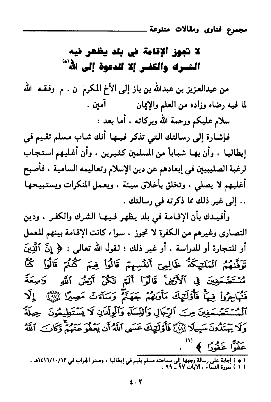(¬1) إجابة على رسالة وجهها إلأى سماحته مسلم يقيم في إيطاليا، وصدر الجواب في 13\10\1416هـ.