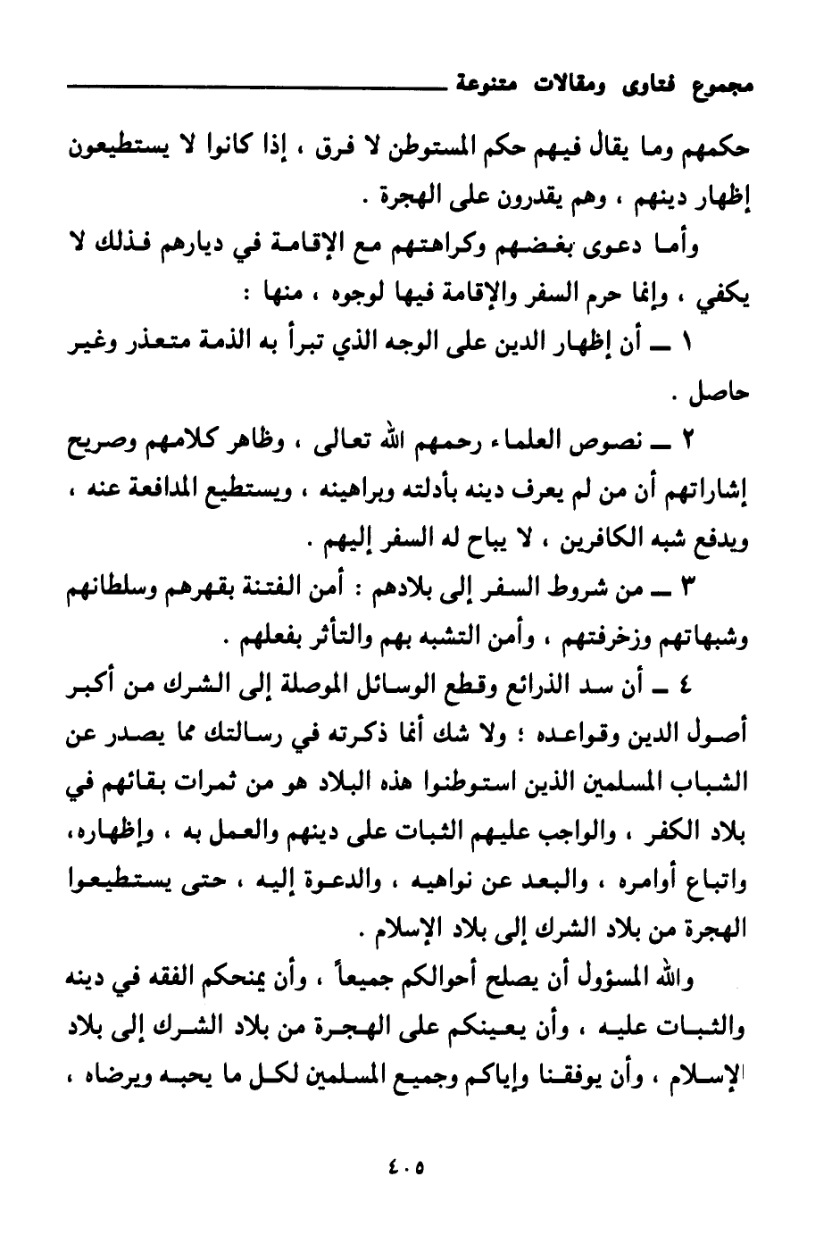 4 - أن سد الذرائع وقطع الوسائل الموصلة إلى الشرك من أكبر أصول الدين وقواعده؛ ولا شك أنما ذكرته في رسالتك مما يصدر عن الشباب المسلمين الذين استوطنوا هذه البلاد هو من ثمرات بقائهم في بلاد الكفر، والواجب عليهم الثبات على دينهم والعمل به، وإظهاره، واتباع أوامره، والبعد عن نواهيه، والدعوة إليه، حتى يستطيعوا الهجرة من بلاد الشرك إلى بلاد الإسلام.