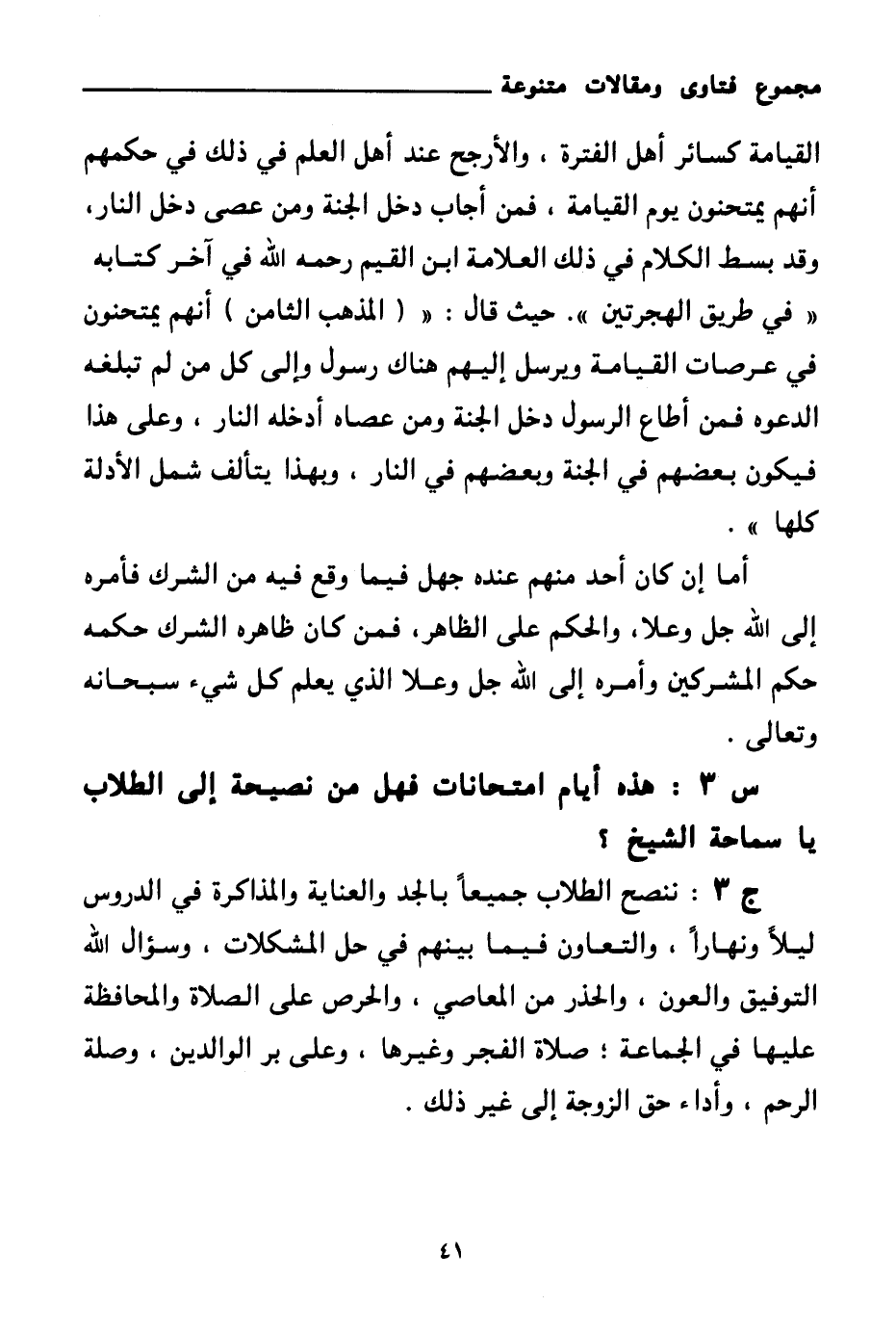 وقد بسط الكلام في ذلك العلامة ابن القيم رحمه الله في آخر كتابه " في طريق الهجرتين ". حيث قال: " (المذهب الثامن) أنهم يمتحنون في عرصات القيامة ويرسل إليهم هناك رسول الله وإلى كل من لم تبلغه الدعوه فمن أطاع الرسول دخل الجنة ومن عصاه أدخله النار، وعلى هذا فيكون بعضهم في الجنة وبعضهم في النار، وبهذا يتألف شمل الأدلة كلها ". أما إن كان أحد منهم عنده جهل فيما وقع فيه من الشرك فأمره إلى الله جل وعلا، والحكم على الظاهر، فمن كان ظاهره الشرك حكمه حكم المشركين وأمره إلى الله جل وعلا الذي يعلم كل شيء سبحانه وتعالى.