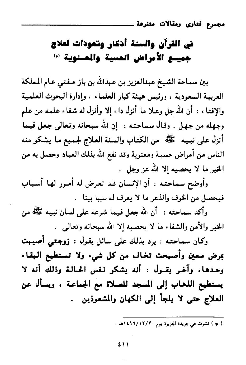 بين سماحة الشيخ عبد العزيز بن عبد الله بن باز مفتي عام المملكة العربية السعودية، ورئيس هيئة كبار العلماء، وإدارة البحوث العلمية والافتاء: أن الله جل وعلا ما أنزل داء إلا وأنزل له شفاء علمه من علم وجهله من جهل. وقال سماحته: إن الله سبحانه وتعالى جعل فيما أنزل على نبيه صلى الله عليه وسلم من الكتاب والسنة العلاج لجميع ما يشكو منه الناس من أمراض حسية ومعنوية وقد نفع الله بذلك العباد وحصل به من الخير ما لا يحصيه إلا الله عز وجل. وأوضح سماحته: أن الإنسان قد تعرض له أمور لها أسباب فيحصل من الخوف والذعر ما لا يعرف له سببا بينا.