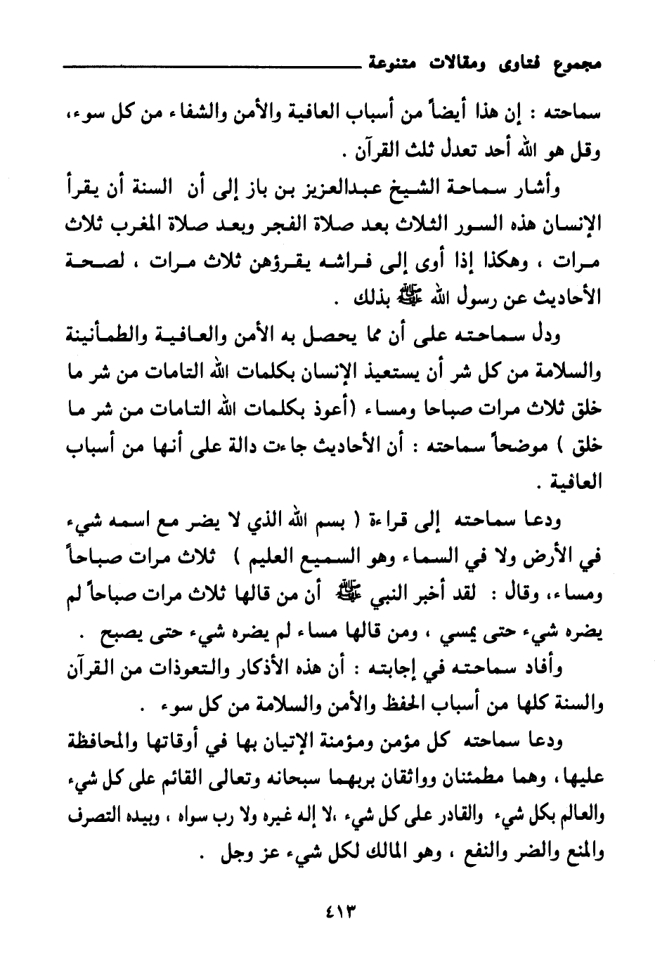 ودعا سماحته إلى قراءة (بسم الله الذي لا يضر مع اسمه شيء في الأرض ولا في السماء وهو السميع العليم) ثلاث مرات صباحا ومساء، وقال: لقد أخبر النبي صلى الله عليه وسلم أن من قالها ثلاث مرات صباحا لم يضره شيء حتى يمسي، ومن قالها مساء لم يضره شيء حتى يصبح. وأفاد سماحته في إجابته: أن هذه الأذكار والتعوذات من القرآن والسنة كلها من أسباب الحفظ والأمن والسلامة من كل سوء.