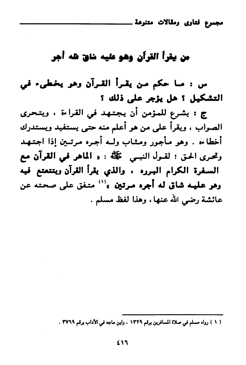 ج: يشرع للمؤمن أن يجتهد في القراءة، ويتحرى الصواب، ويقرأ على من هو أعلم منه حتى يستفيد ويستدرك أخطاءه. وهو مأجور ومثاب وله أجره مرتين إذا اجتهد وتحرى الحق؛ لقول النبي صلى الله عليه وسلم: «الماهر في القرآن مع السفرة الكرام البررة والذي يقرأ القرآن ويتتعتع فيه وهو عليه شاق له أجره مرتين (¬1) » متفق على صحته عن عائشة رضي الله عنها، وهذا لفظ مسلم.