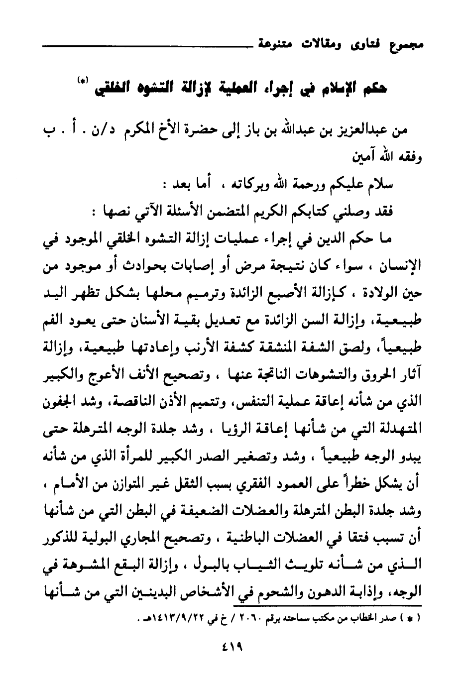 فقد وصلني كتابكم الكريم المتضمن الأسئلة الآتي نصها: ما حكم الدين في إجراء عمليات إزالة التشوه الخلقي الموجود في الإنسان، سواء كان نتيجة مرض أو إصابات بحوادث أو موجود من حين الولادة، كإزالة الأصبع الزائدة وترميم محلها بشكل تظهر اليد طبيعية، وإزالة السن الزائدة مع تعديل بقية الأسنان حتى يعود الفم طبيعيا، ولصق الشفة المنشقة كشفة الأرنب وإعادتها طبيعية، وإزالة آثار الحروق والتشوهات الناتجة عنها، وتصحيح الأنف الأعوج والكبير الذي من شأنه إعاقة عملية التنفس، وتتميم الأذن الناقصة، وشد الجفون المتهدلة التي من شأنها إعاقة الرؤيا، وشد جلدة الوجه المترهلة حتى يبدو الوجه طبيعيا، وشد وتصغير الصدر الكبير للمرأة الذي من شأنه أن يشكل خطرا على العمود الفقري بسبب الثقل غير المتوازن من الأمام، وشد جلدة البطن المترهلة والعضلات الضعيفة في البطن التي من شأنها أن تسبب فتقا في العضلات الباطنية، وتصحيح المجاري البولية للذكور الذي من شأنه تلويث الثياب بالبول، وإزالة البقع المشوهة في الوجه، وإذابة الدهون والشحوم في الأشخاص البدينين التي من شأنها