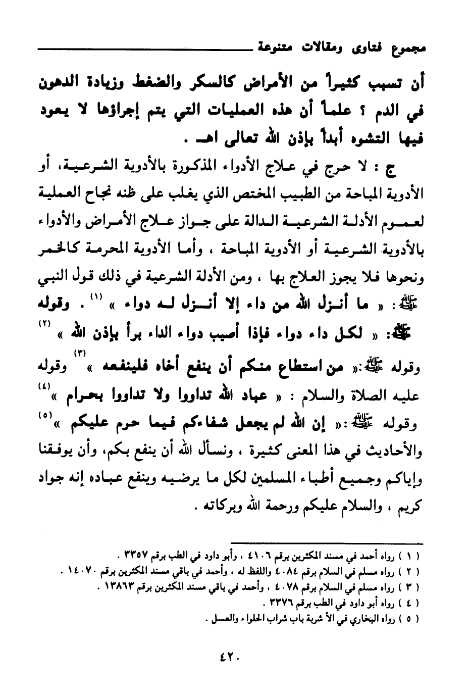 وقوله صلى الله عليه وسلم: «لكل داء دواء فإذا أصيب دواء الداء برأ بإذن الله (¬1) » وقوله صلى الله عليه وسلم: «من استطاع منكم أن ينفع أخاه فلينفعه (¬2) » وقوله عليه الصلاة والسلام: «عباد الله تداووا ولا تداووا بحرام (¬3) » وقوله صلى الله عليه وسلم: «إن الله لم يجعل شفاءكم فيما حرم عليكم (¬4) » والأحاديث في هذا المعنى كثيرة، ونسأل الله أن ينفع بكم، وأن يوفقنا وإياكم وجميع أطباء المسلمين لكل ما يرضيه وينفع عباده إنه جواد كريم، والسلام عليكم ورحمة الله وبركاته.