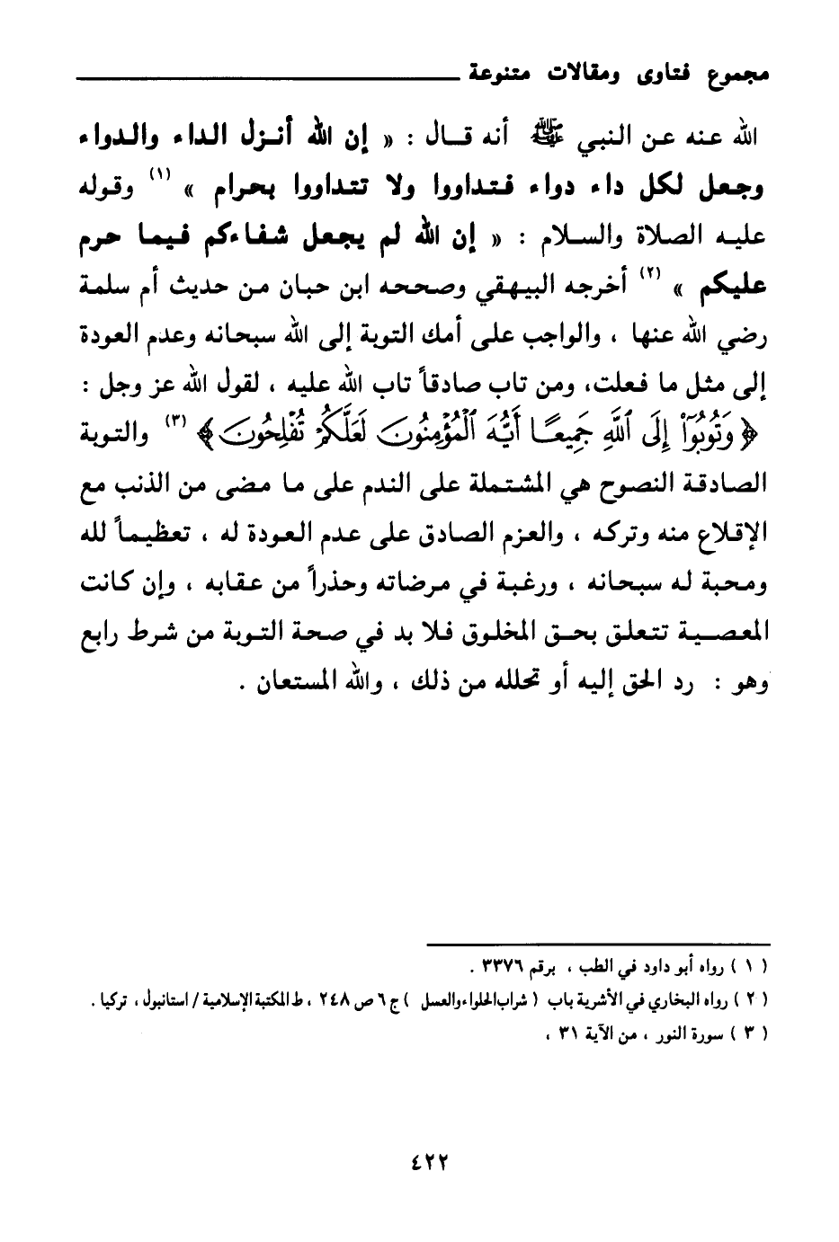 الله عنه عن النبي صلى الله عليه وسلم أنه قال: «إن الله أنزل الداء والدواء وجعل لكل داء دواء فتداووا ولا تتداووا بحرام (¬1) » وقوله عليه الصلاة والسلام: «إن الله لم يجعل شفاءكم فيما حرم عليكم (¬2) » أخرجه البيهقي وصححه ابن حبان من حديث أم سلمة رضي الله عنها، والواجب على أمك التوبة إلى الله سبحانه وعدم العودة إلى مثل ما فعلت، ومن تاب صادقا تاب الله عليه، لقول الله عز وجل: {وَتُوبُوا إِلَى اللَّهِ جَمِيعًا أَيُّهَ الْمُؤْمِنُونَ لَعَلَّكُمْ تُفْلِحُونَ} (¬3) والتوبة الصادقة النصوح هي المشتملة على الندم على ما مضى من الذنب مع الإقلاع منه وتركه، والعزم الصادق على عدم العودة له، تعظيما لله ومحبة له سبحانه، ورغبة في مرضاته وحذرا من عقابه، وإن كانت المعصية تتعلق بحق المخلوق فلا بد في صحة التوبة من شرط رابع وهو: رد الحق إليه أو تحلله من ذلك، والله المستعان.