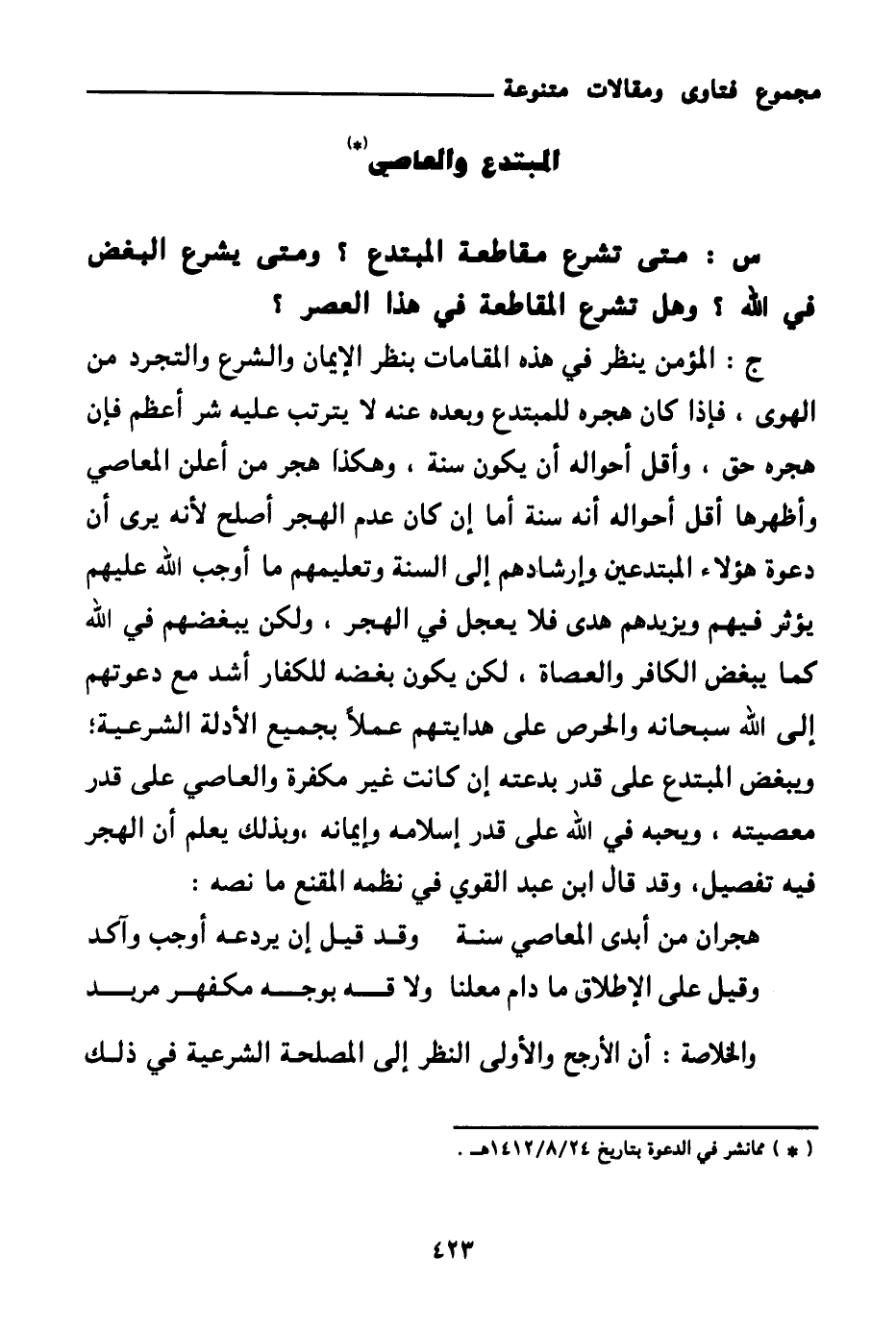 ج: المؤمن ينظر في هذه المقامات بنظر الإيمان والشرع والتجرد من الهوى، فإذا كان هجره للمبتدع وبعده عنه لا يترتب عليه شر أعظم فإن هجره حق، وأقل أحواله أن يكون سنة، وهكذا هجر من أعلن المعاصي وأظهرها أقل أحواله أنه سنة أما إن كان عدم الهجر أصلح لأنه يرى أن دعوة هؤلاء المبتدعين وإرشادهم إلى السنة وتعليمهم ما أوجب الله عليهم يؤثر فيهم ويزيدهم هدى فلا يعجل في الهجر، ولكن يبغضهم في الله كما يبغض الكافر والعصاة، لكن يكون بغضه للكفار أشد مع دعوتهم إلى الله سبحانه والحرص على هدايتهم عملا بجميع الأدلة الشرعية؛ ويبغض المبتدع على قدر بدعته إن كانت غير مكفرة والعاصي على قدر معصيته، ويحبه في الله على قدر إسلامه وإيمانه، وبذلك يعلم أن الهجر فيه تفصيل، وقد قال ابن عبد القوي في نظمه المقنع ما نصه: